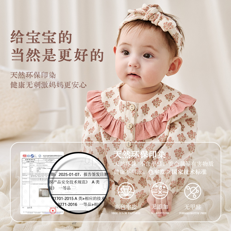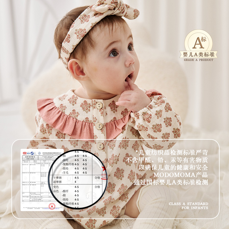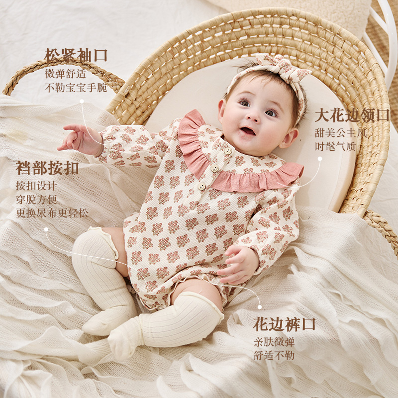 modomoma婴儿衣服秋装 纯棉花边连体衣女宝宝满月百天哈衣洋气爬服