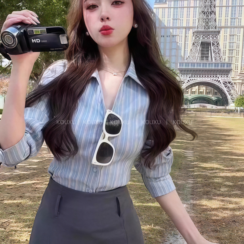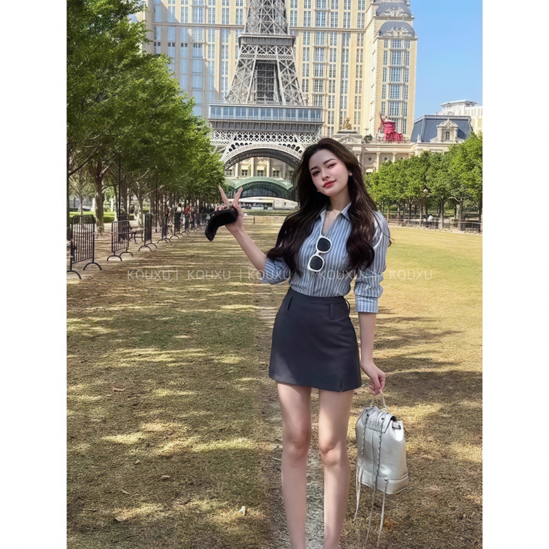 高腰西装 学院风韩系套装 收腰衬衣 衬衫 包臀裙显瘦半身裙 条纹长袖