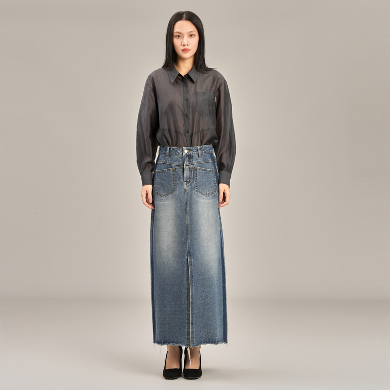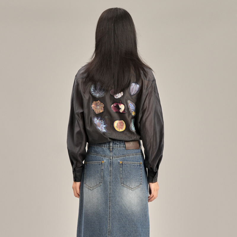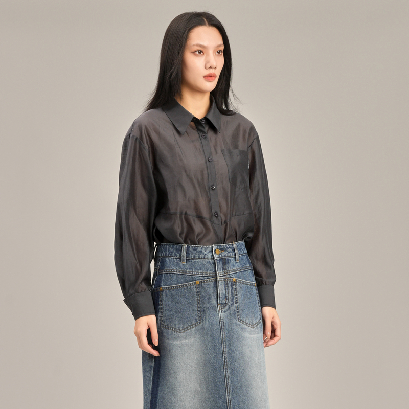 新款 2025春季 微透设计通勤翻领上衣女 衬衫 XG雪歌深灰色莱赛尔长袖