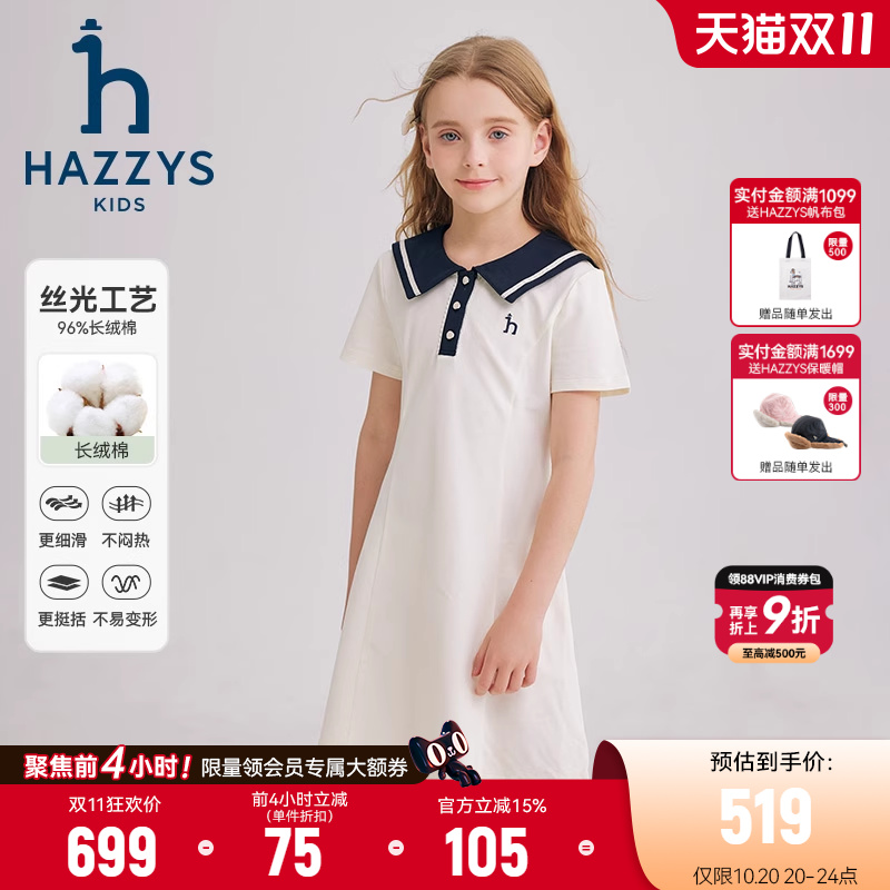 hazzys哈吉斯童装 女童连衣裙2025夏新中大童海军翻领气质polo裙