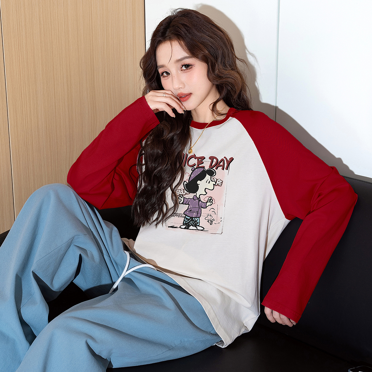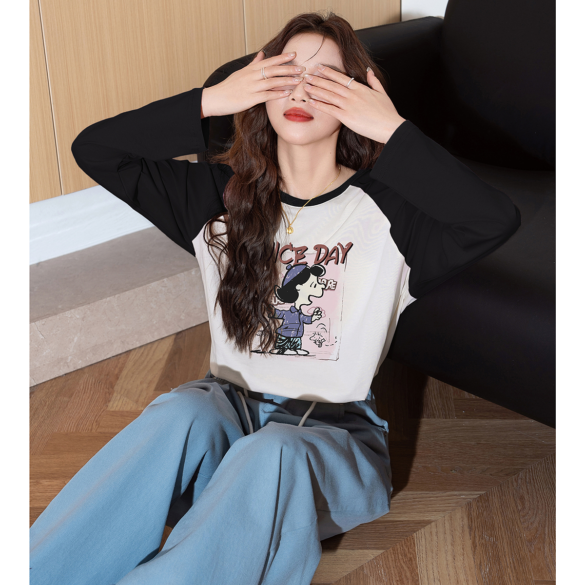 圆领撞色百搭宽松纯棉打底衫 唐狮2025春季 T恤插肩袖 女长袖 t恤 新款