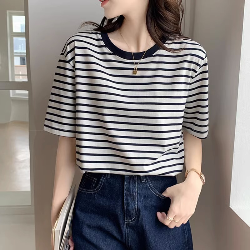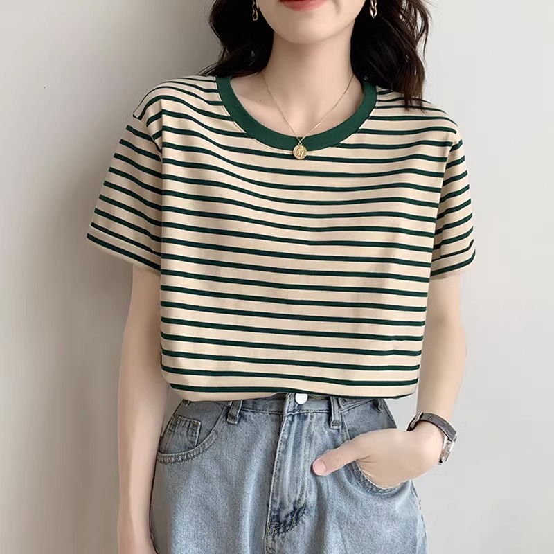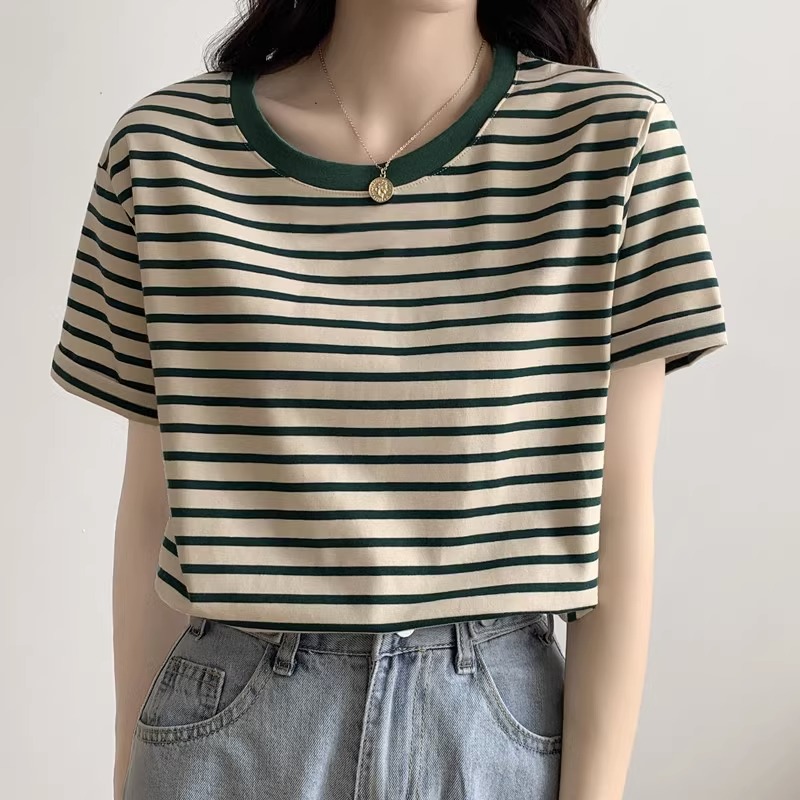 ins潮短袖 显瘦T恤女韩系慵懒风大码 2023新款 绿色复古条纹上衣夏季