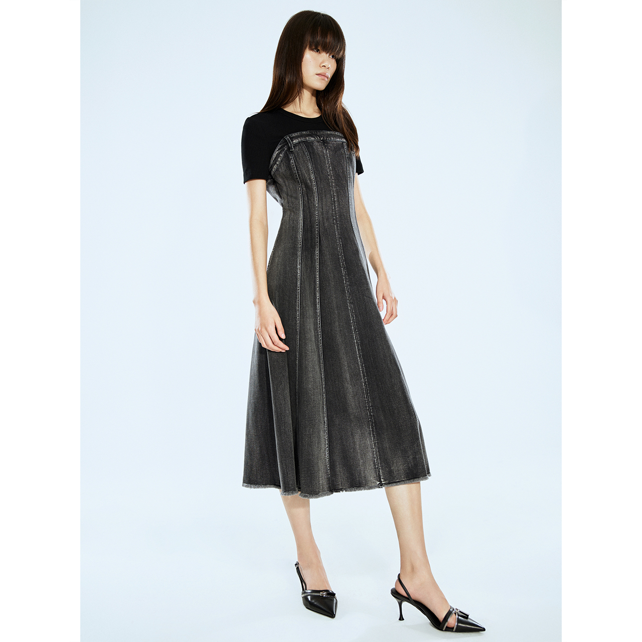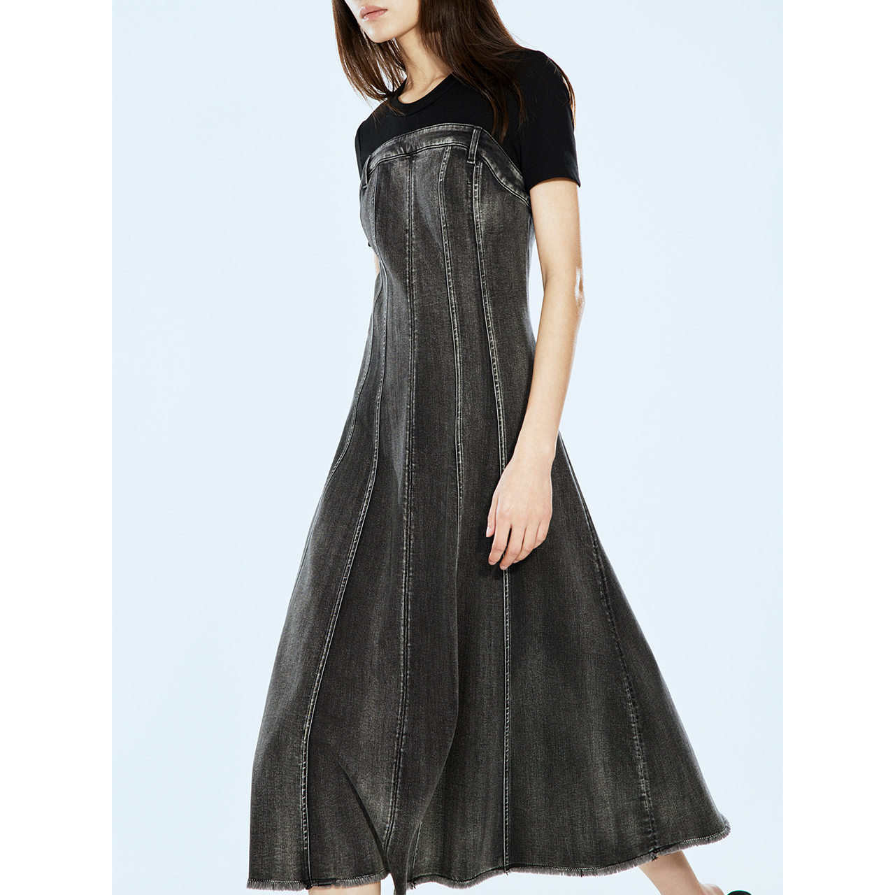 ONLY2025秋季 时髦针织拼接假两件A字百褶牛仔短裙连衣裙女 新款