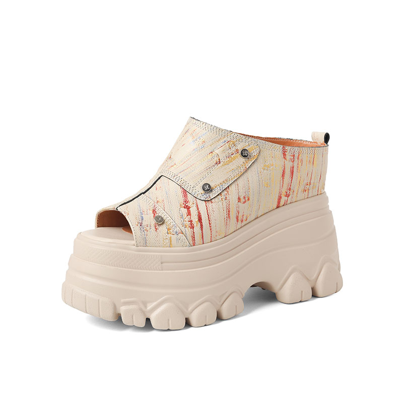 无后跟轻便凉鞋 鱼嘴坡跟百搭透气厚底拖鞋 真皮夏季 12cm内增高女鞋