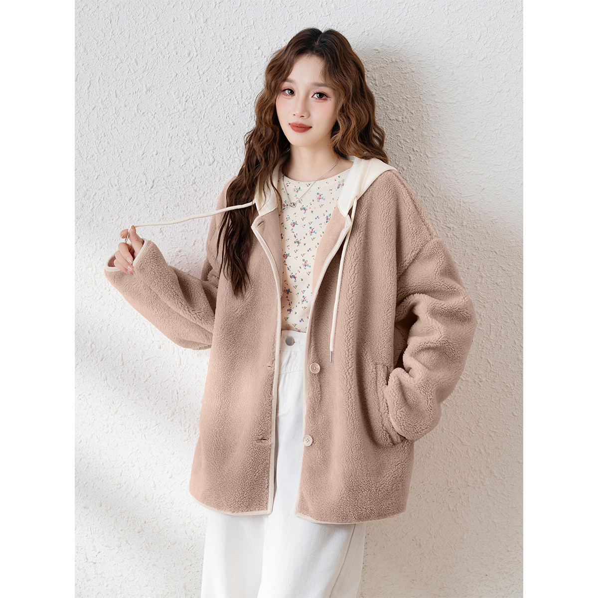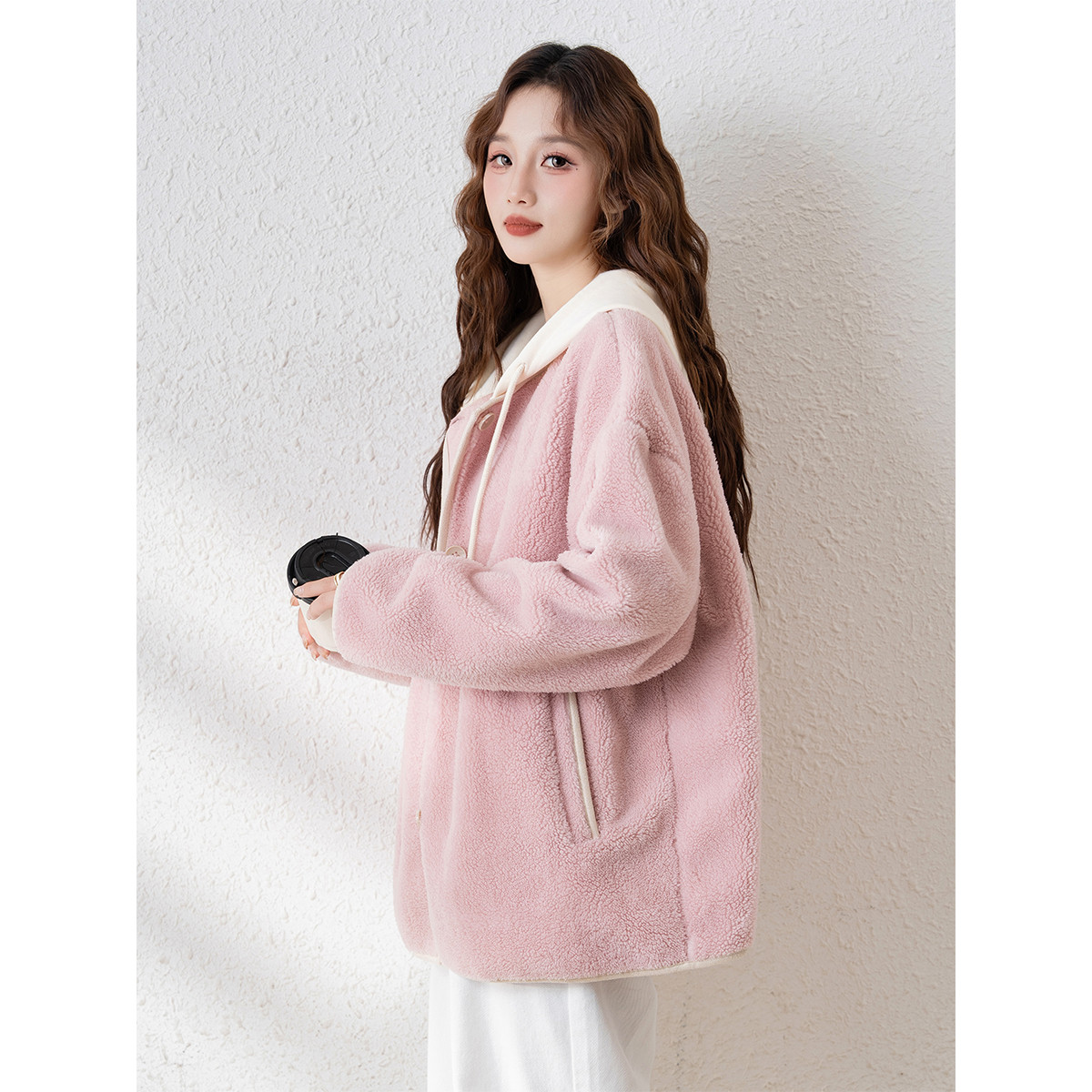 唐狮2025春季 外套女连帽拼接仿羊羔毛加厚保暖宽松休闲上衣 新款