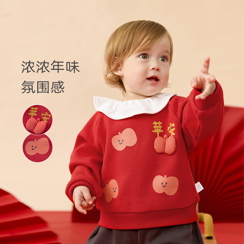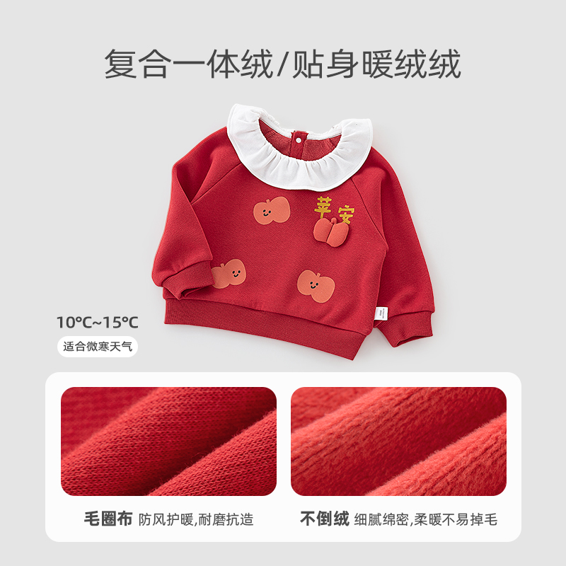麦拉贝拉女宝宝加绒卫衣可爱娃娃领婴幼儿新年红色衣服中国风