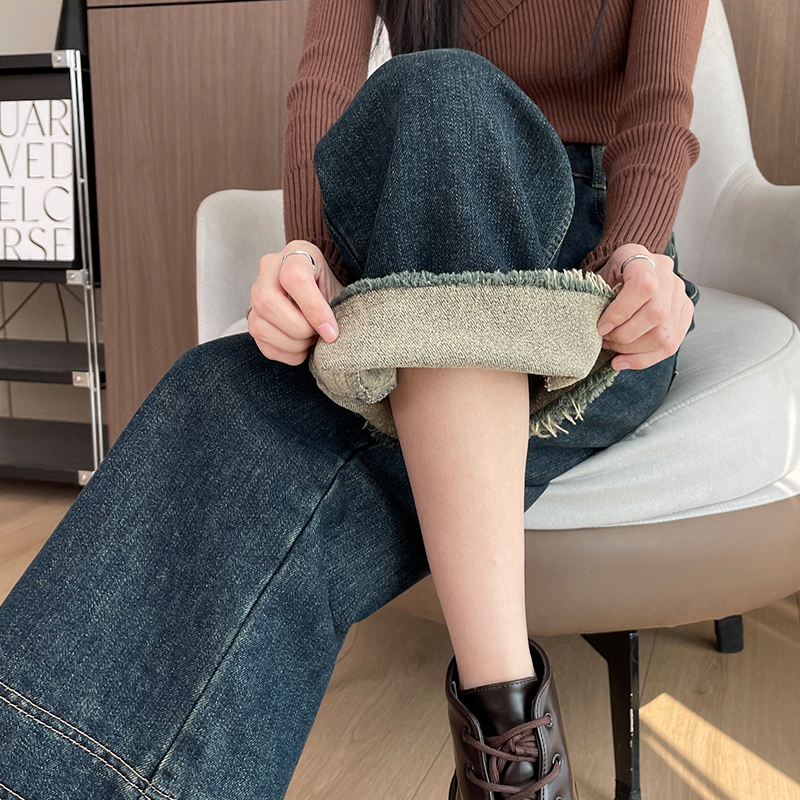 直筒裤 阔腿牛仔裤 加绒加厚深蓝色九分小个子窄版 2025新款 女秋冬季