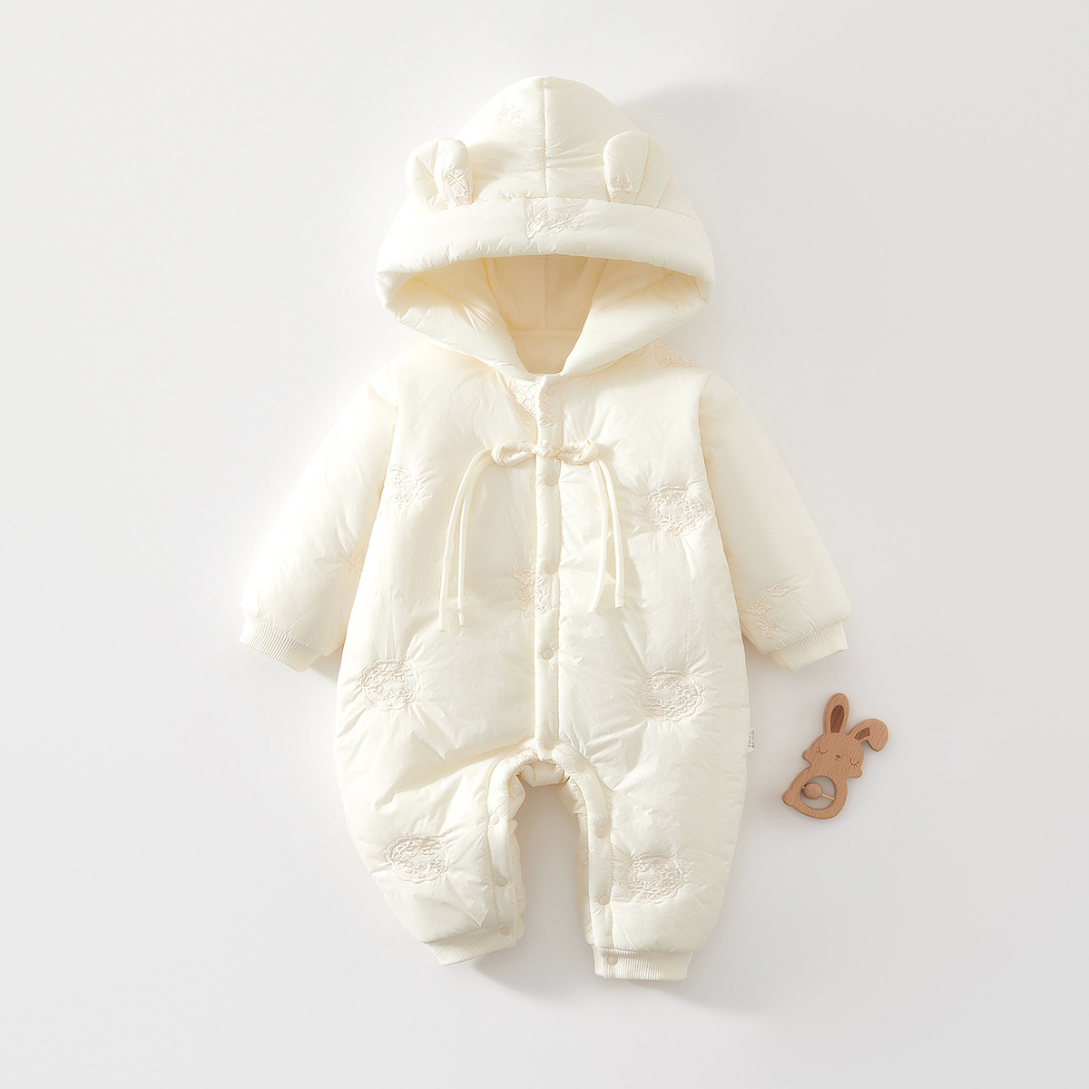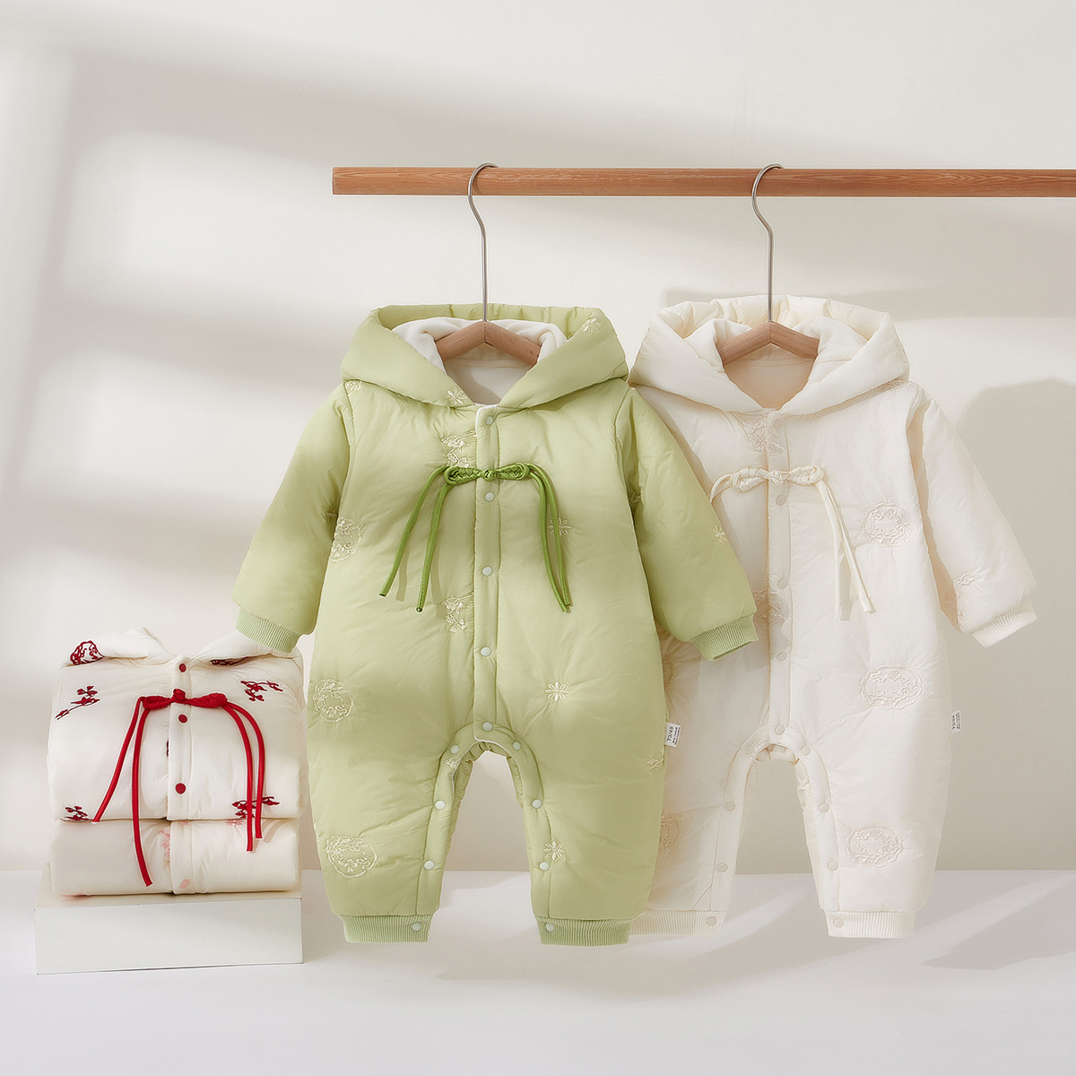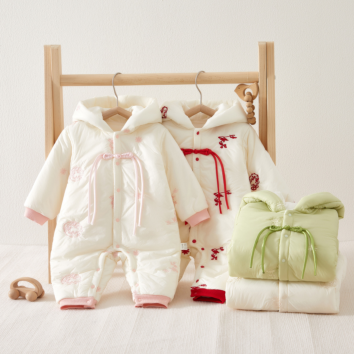 女宝宝婴儿连体衣保暖仿羽加绒加厚国风款 哈衣爬服新生儿外出服冬