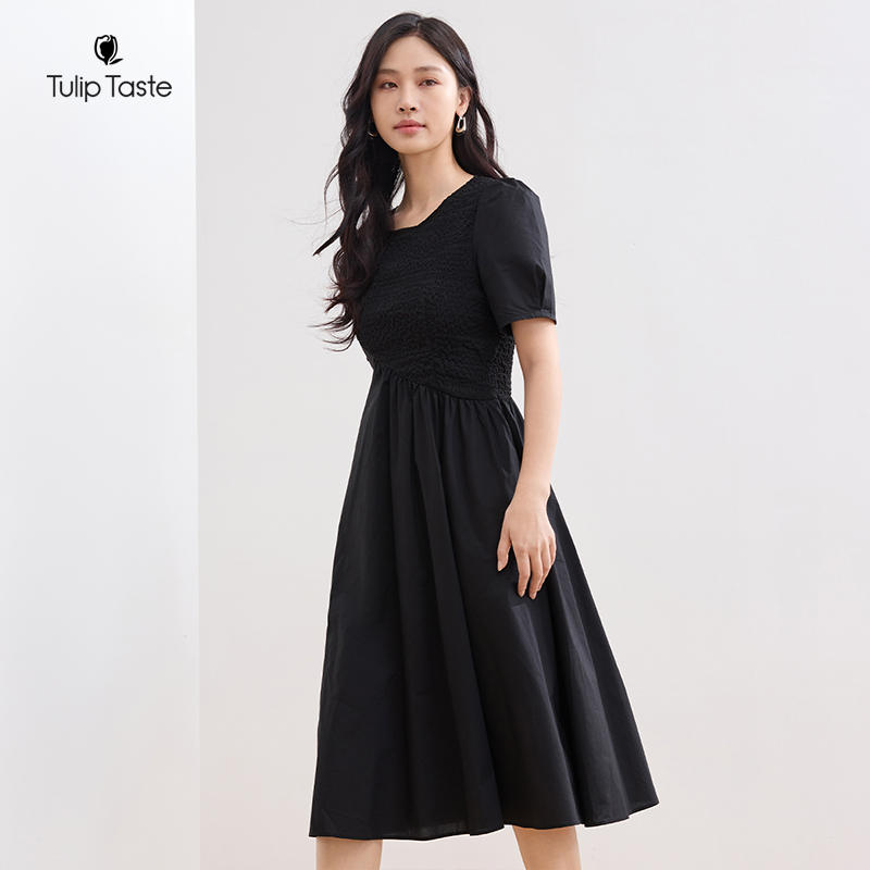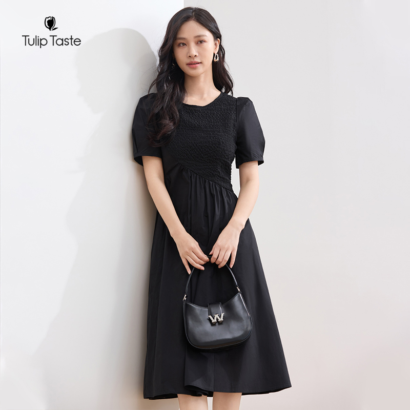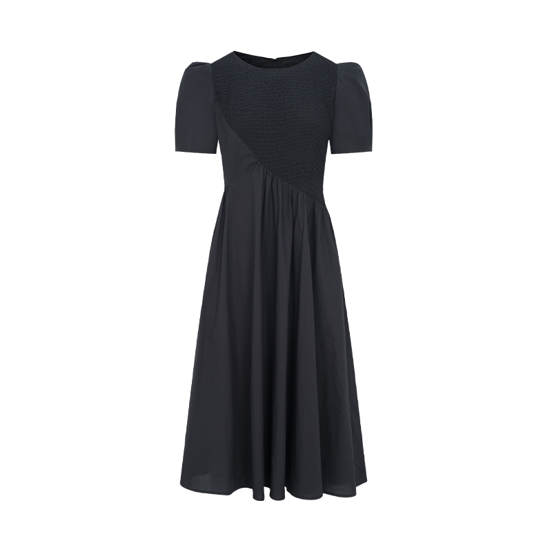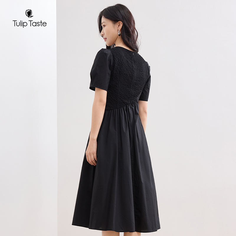 拼接法式 时尚 圆领收腰A字裙 连衣裙女气质优雅夏季 郁香菲泡泡袖
