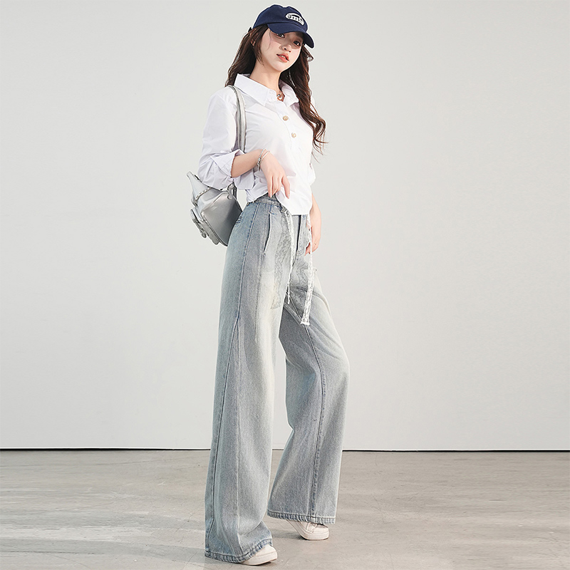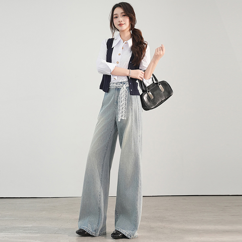 阔腿气质拖地女牛仔裤 白鹿语设计感直筒蕾丝系带高腰长裤 25夏新款