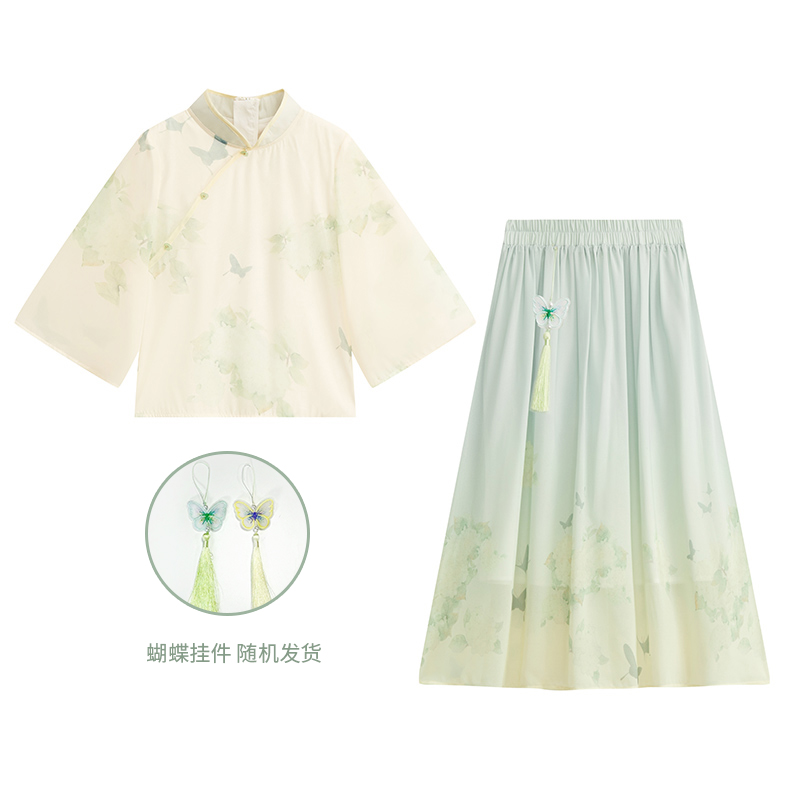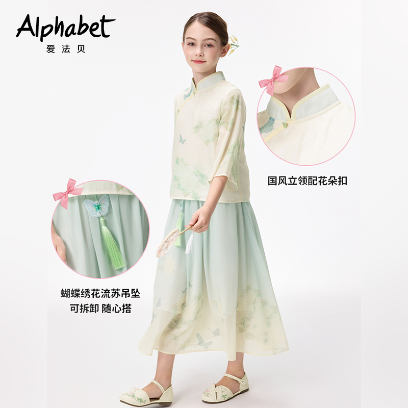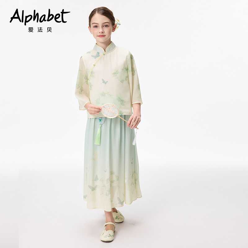 爱法贝女童汉服2025春夏新中式 半裙 国风改良旗袍印花两件套半袖