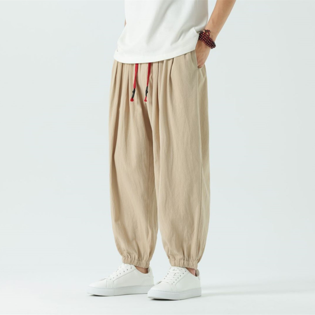 男夏季 棉麻阔腿休闲运动裤 薄款 子宽松束脚灯笼裤 九分裤 日系亚麻裤