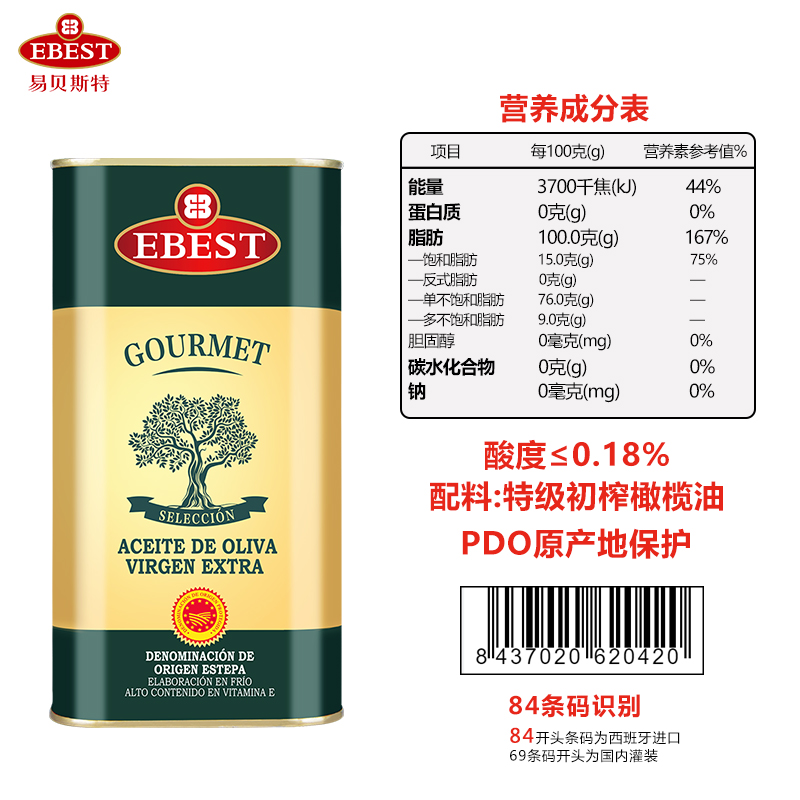 进口健康 易贝斯特PDO1L铁听特级初榨橄榄油西班牙原装 生饮