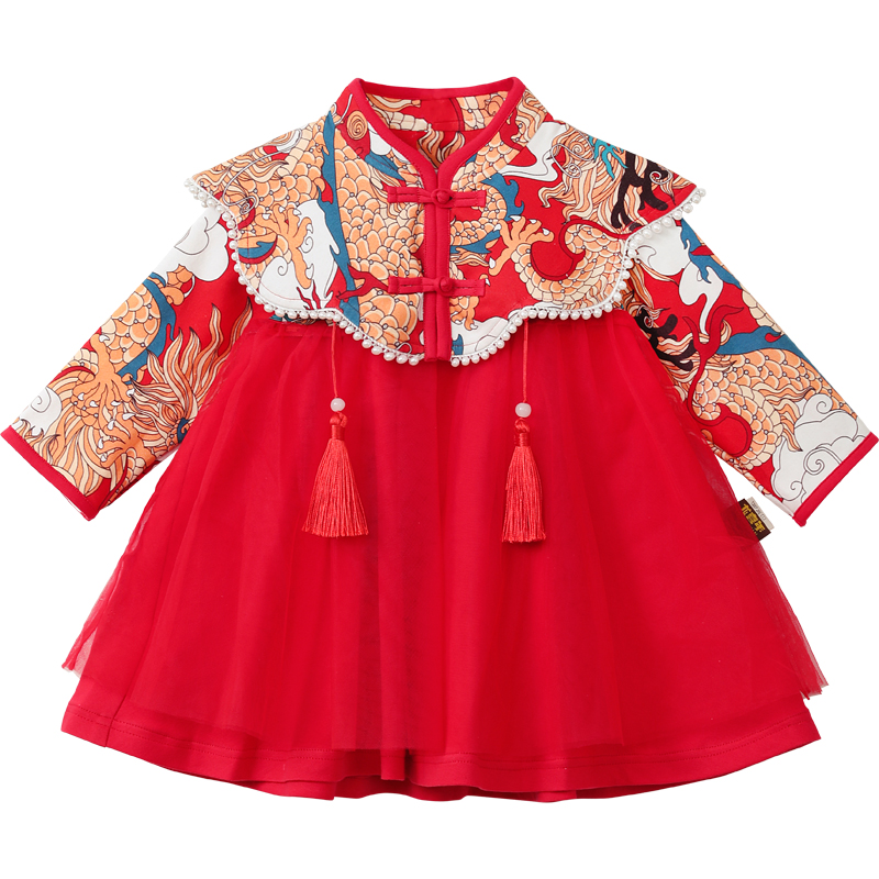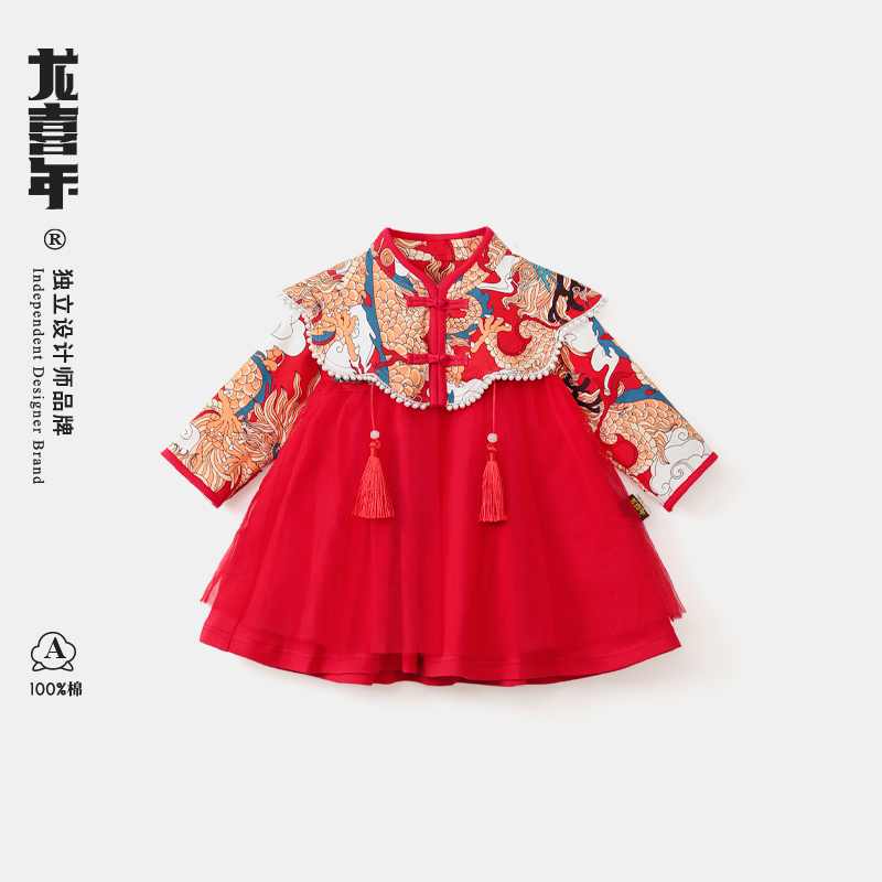 龙拜年服周岁女宝宝礼服高端儿童裙子中式 国风公主抓周宴红色春秋