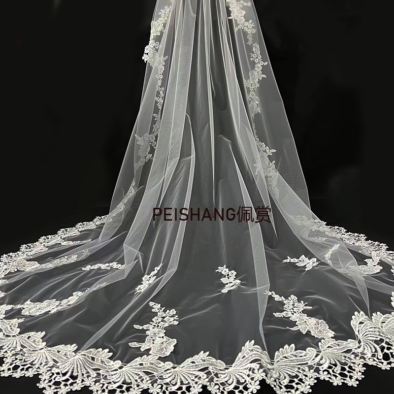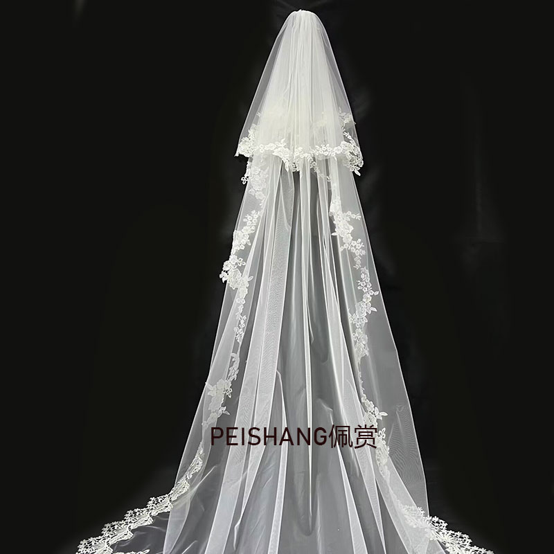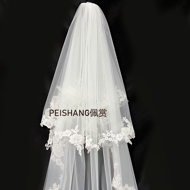 白色长款 拖尾蕾丝花边头纱婚纱遮面双层婚礼拍照森系新娘长头纱
