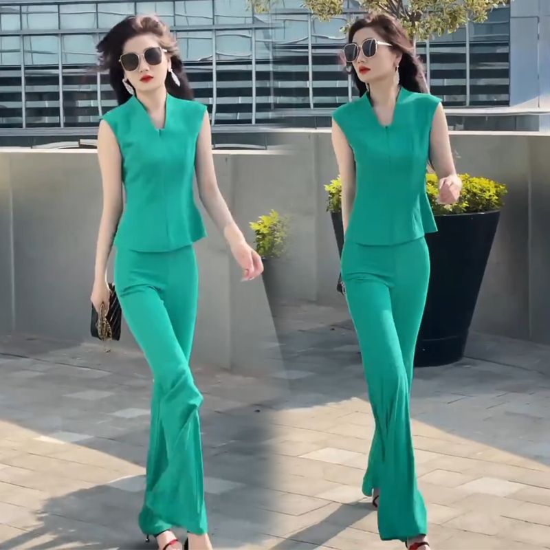 上衣微喇裤 网红同款 女夏洋气显瘦V领原创坎袖 套装 两件套 时尚