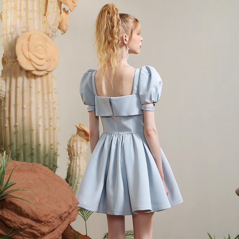 茬客立体花朵蓝色连衣裙女2025年夏季 裙子 气质减龄收腰显瘦泡泡袖