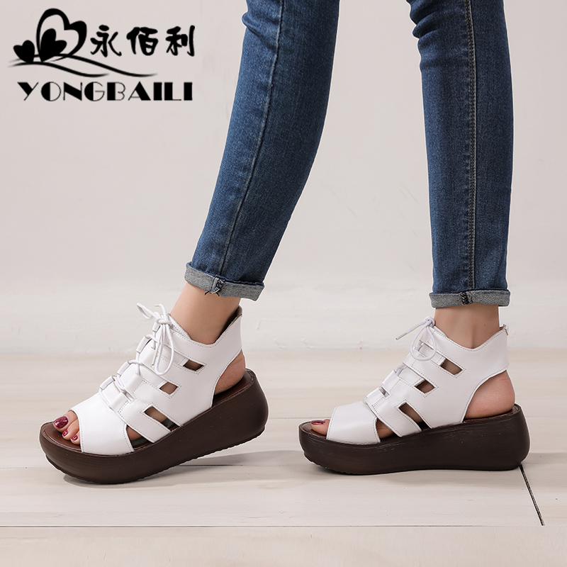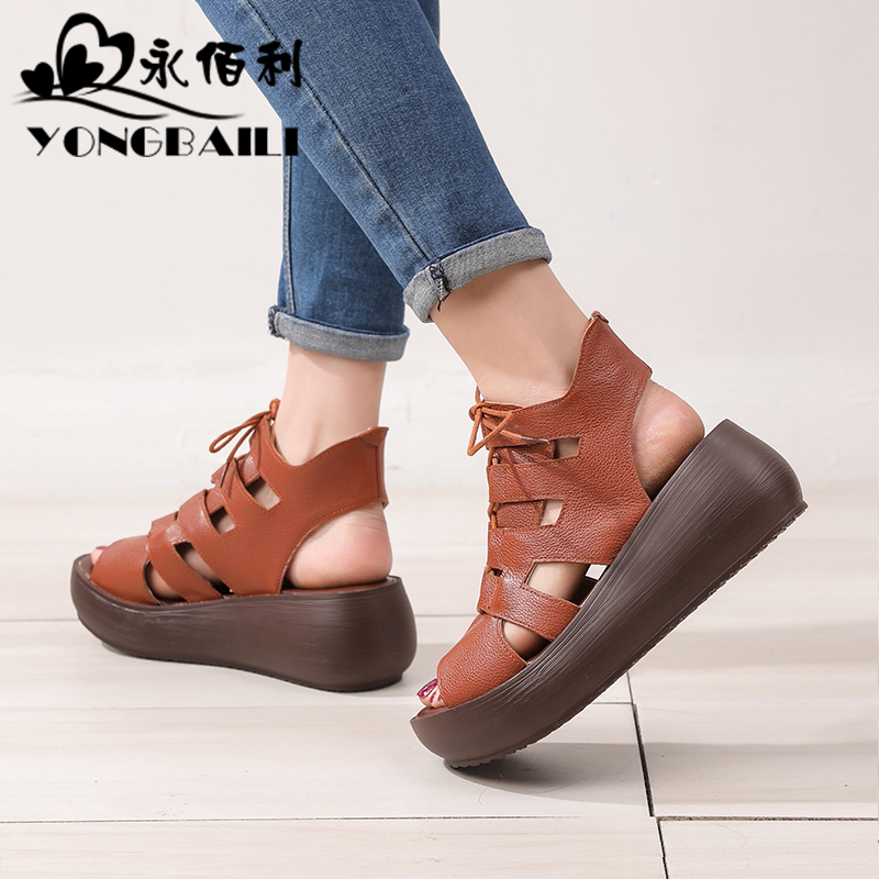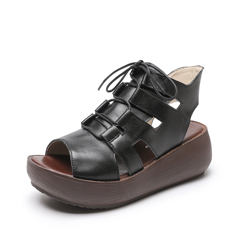 女2025夏季 皮鞋 新款 休闲系带圆头女鞋 软底松糕鞋 厚底真皮高跟凉鞋