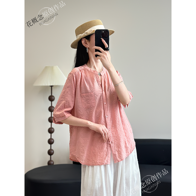 上衣 韩系条纹薄气质减龄遮肉百搭中袖 花概念夏季 剪刀领泡泡纱衬衫