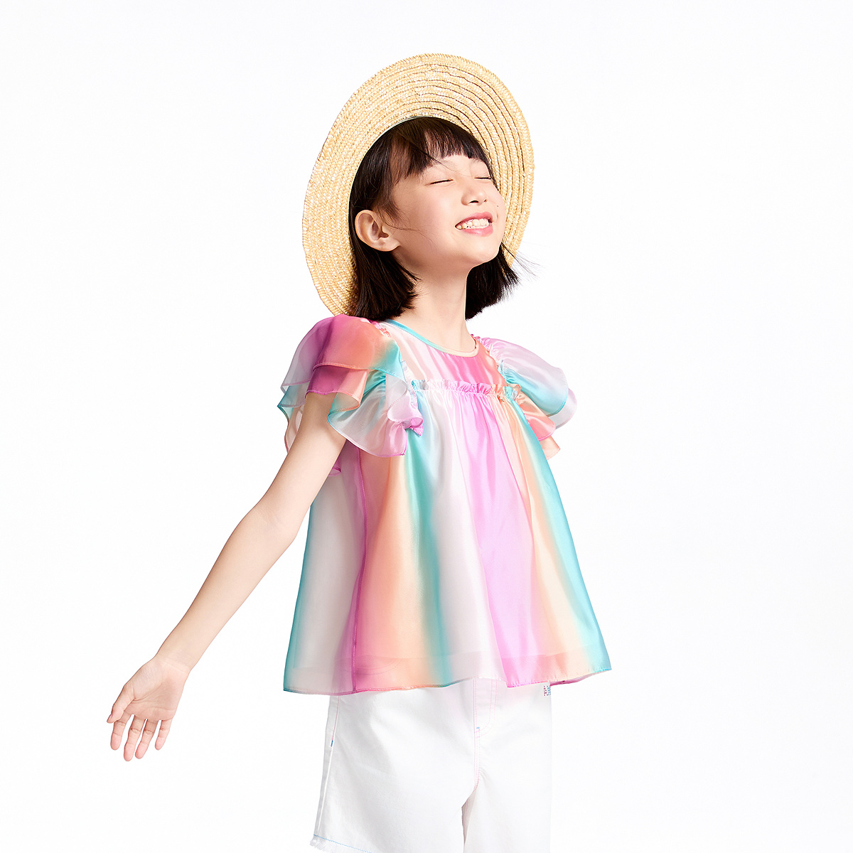 女童翻领短袖 安奈儿童装 上衣2025夏彩虹T恤多巴胺 商场同款