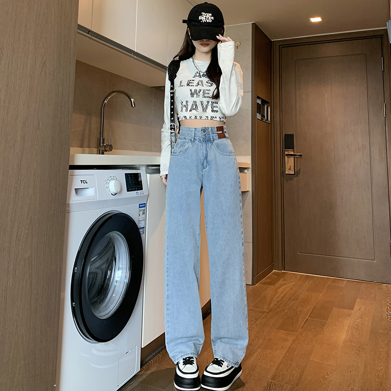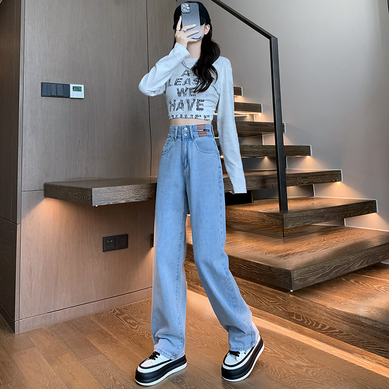 直筒拖地长裤 高腰加绒阔腿牛仔裤 子胖mm大码 宽松显瘦裤 女秋冬新款