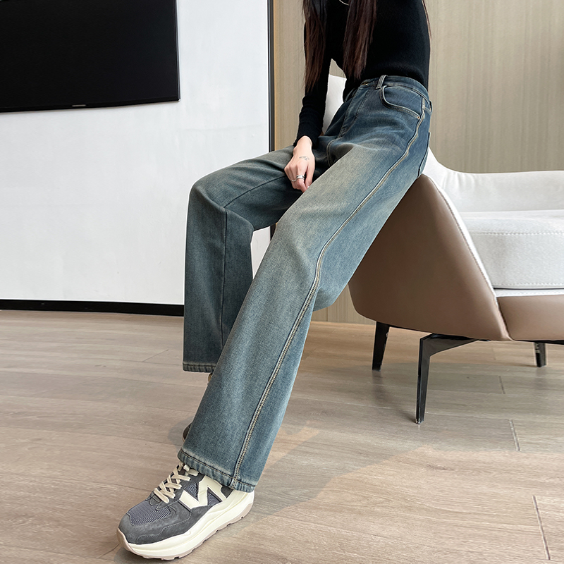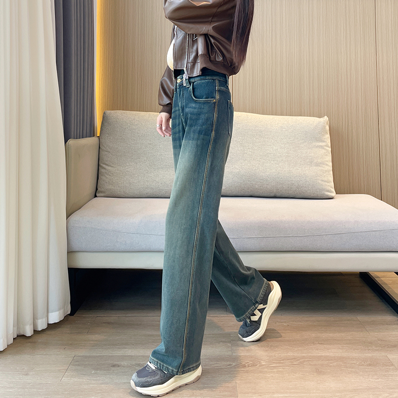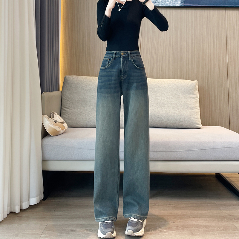 加厚高腰显瘦宽松直筒拖地长裤 2025新款 子 女秋冬季 加绒阔腿牛仔裤