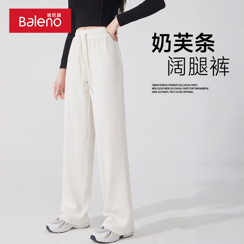 高腰显瘦阔腿裤 新款 女2025年春夏季 班尼路黑色奶芙条直筒休闲裤