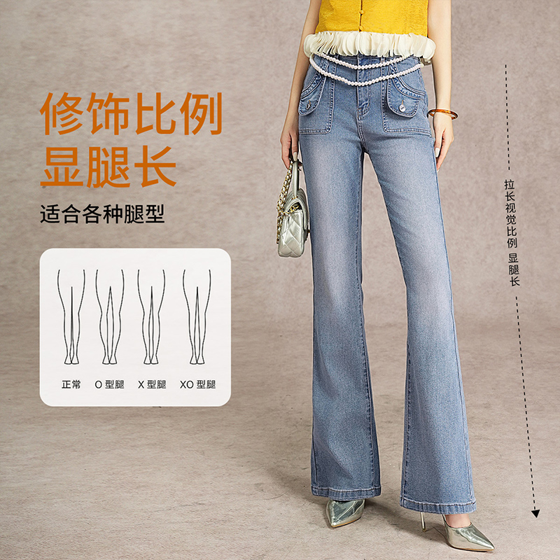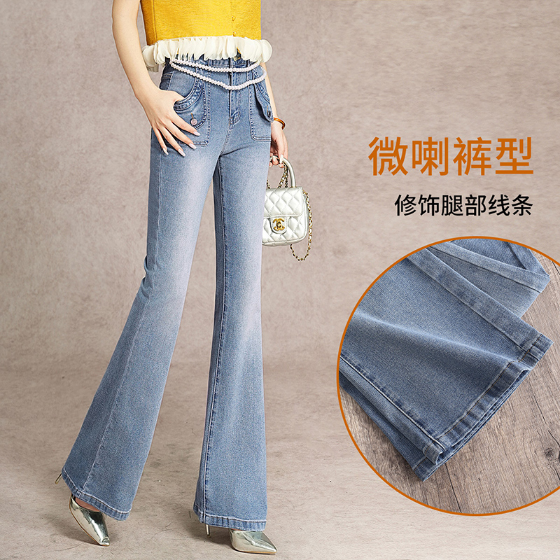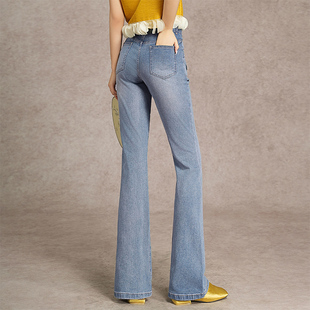 弹力紧身显瘦长裤 白鹿语复古水洗高腰微喇牛仔裤 女蓝色2025春款
