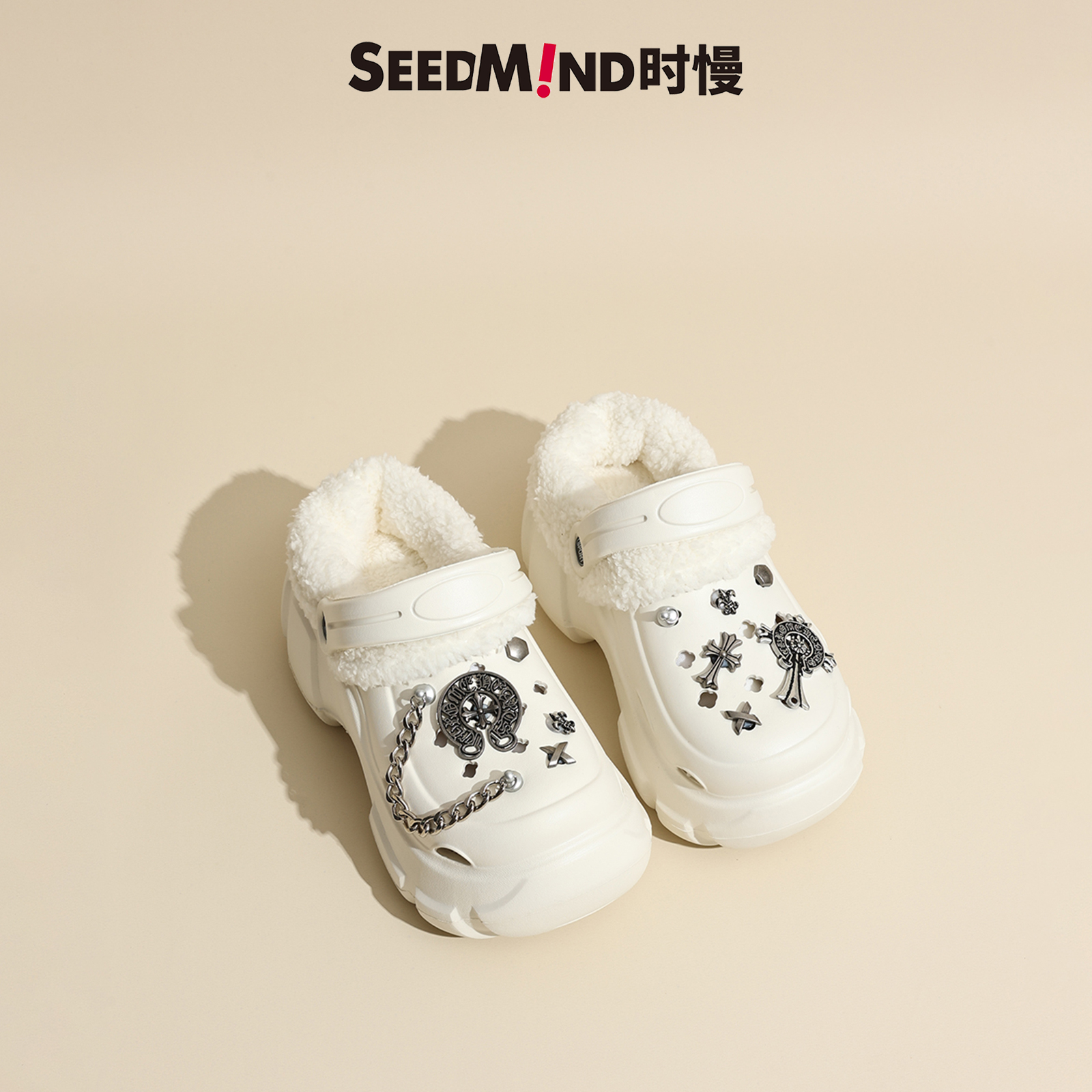 女士十字架带绒棉拖鞋 冬季 2025新款 时慢外穿厚底可拆卸加绒洞洞鞋
