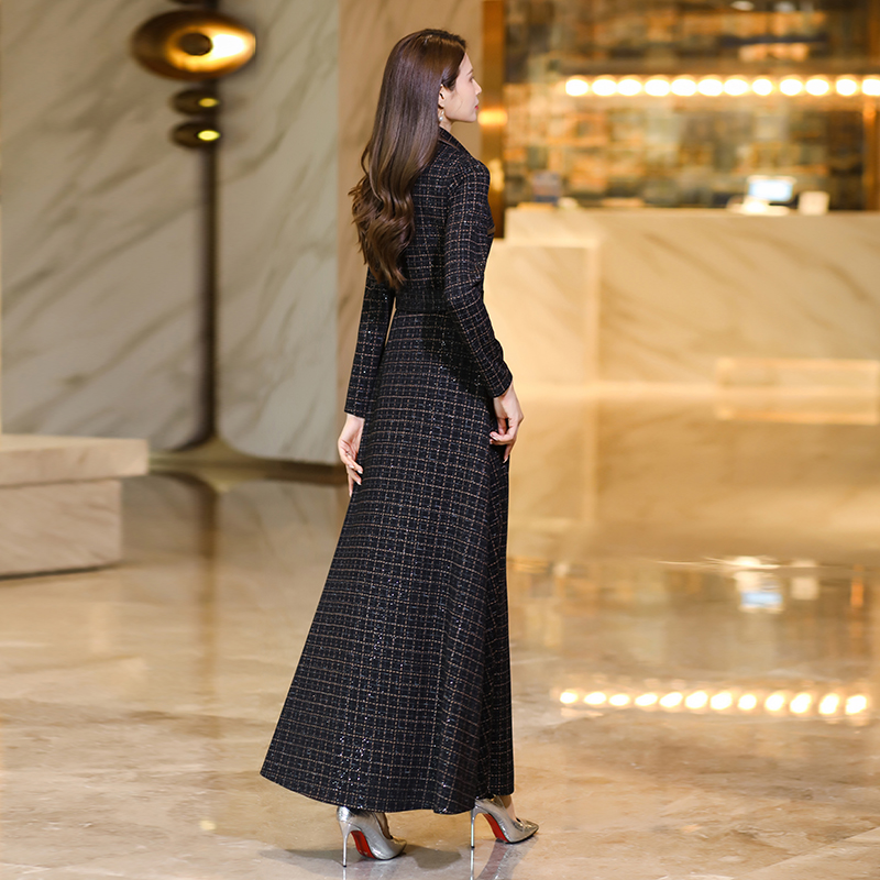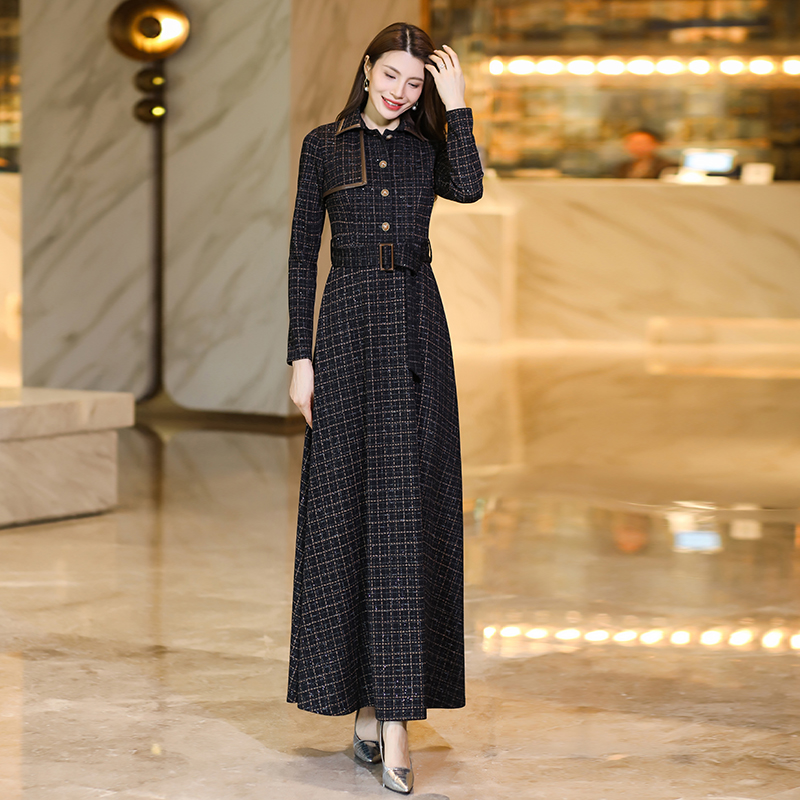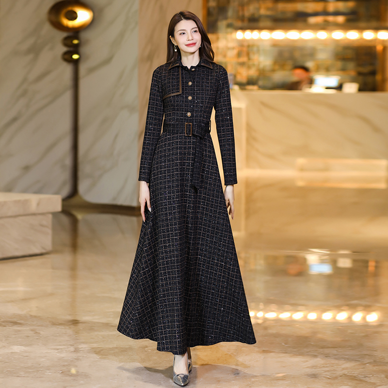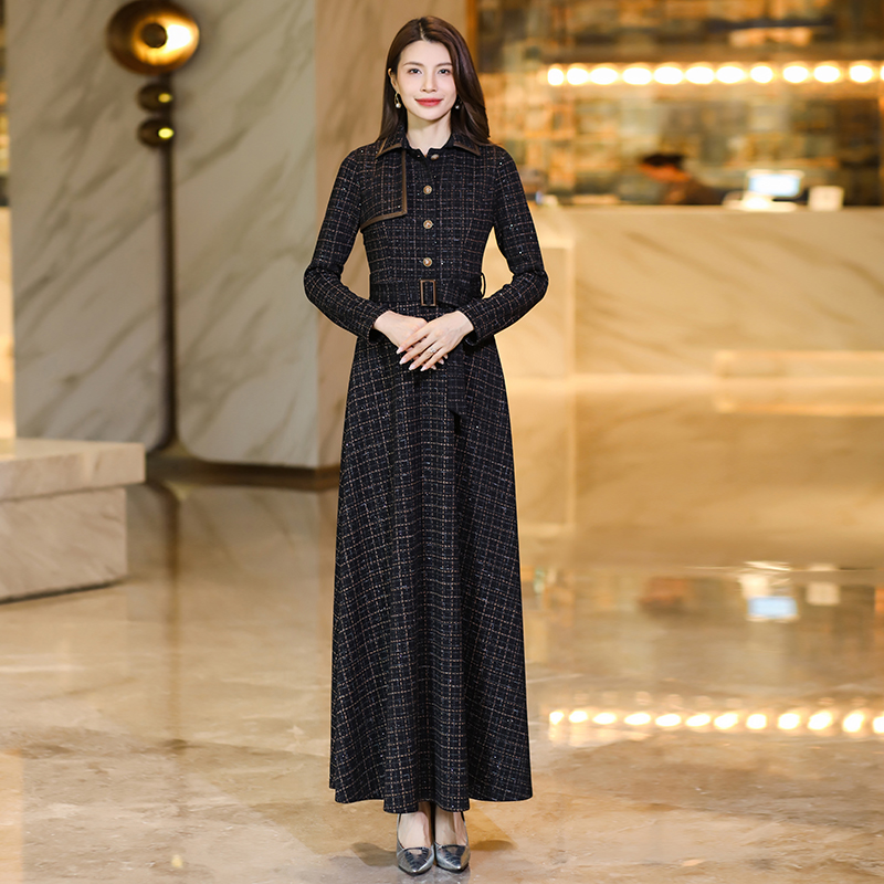 黑色格子连衣裙高端精致2025秋季 气质显瘦超长裙到脚踝1013 新款