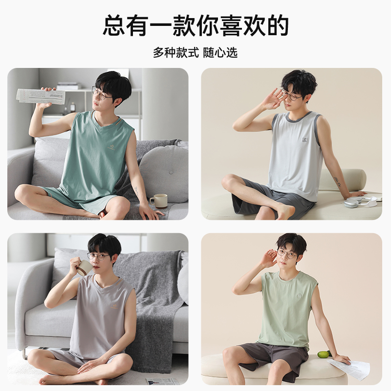 棉绸无袖 薄款 短裤 冰丝凉感加大码 猫人背心睡衣男士 家居服套装 夏季