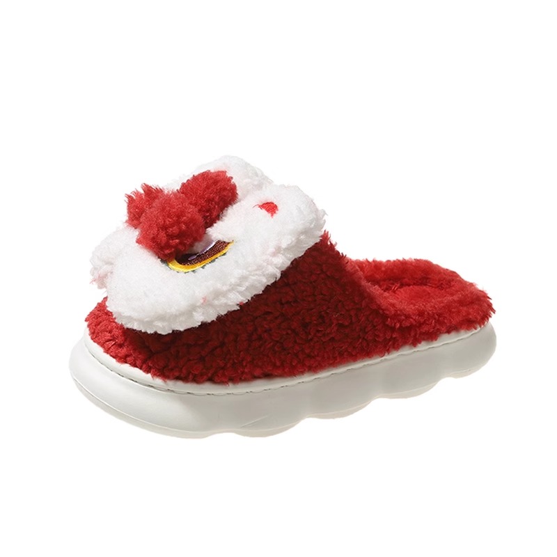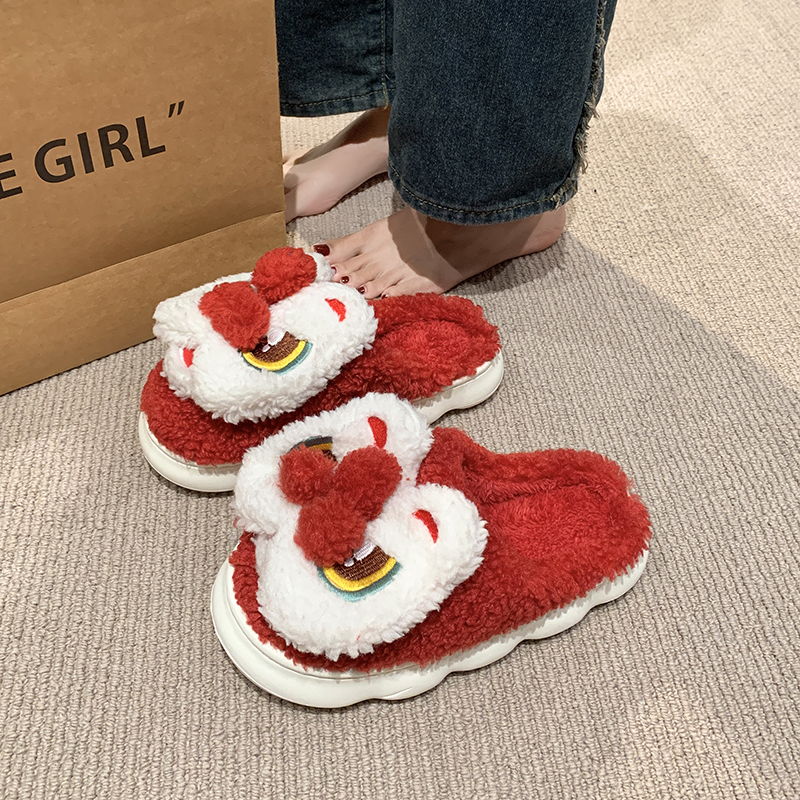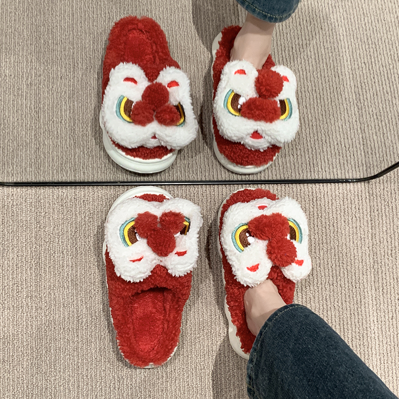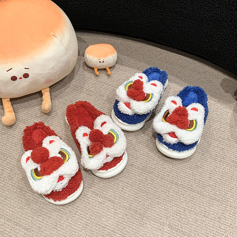 室内家居民族国潮风保暖情侣毛绒棉拖鞋 2025新款 女冬季 醒狮棉拖鞋