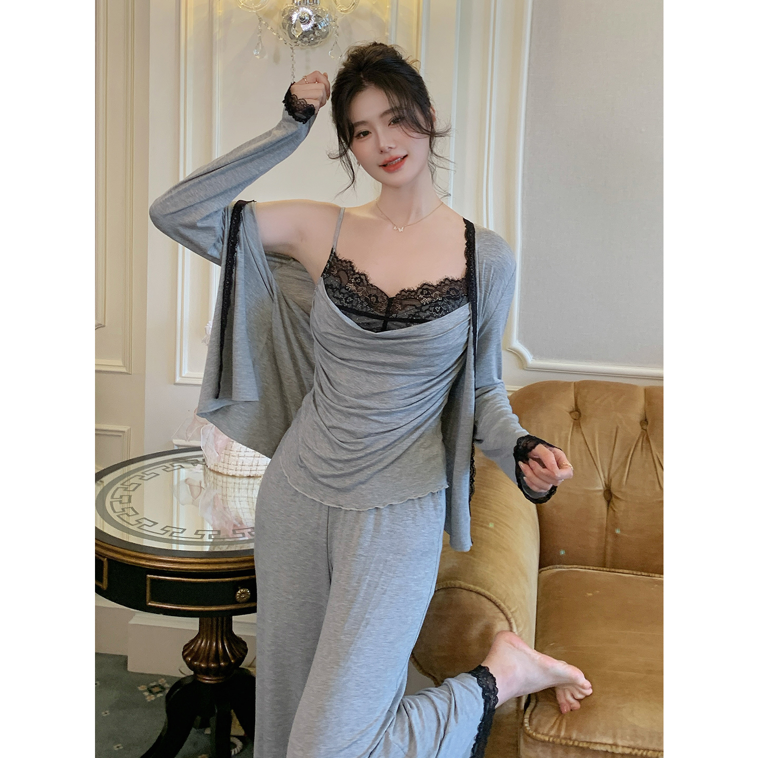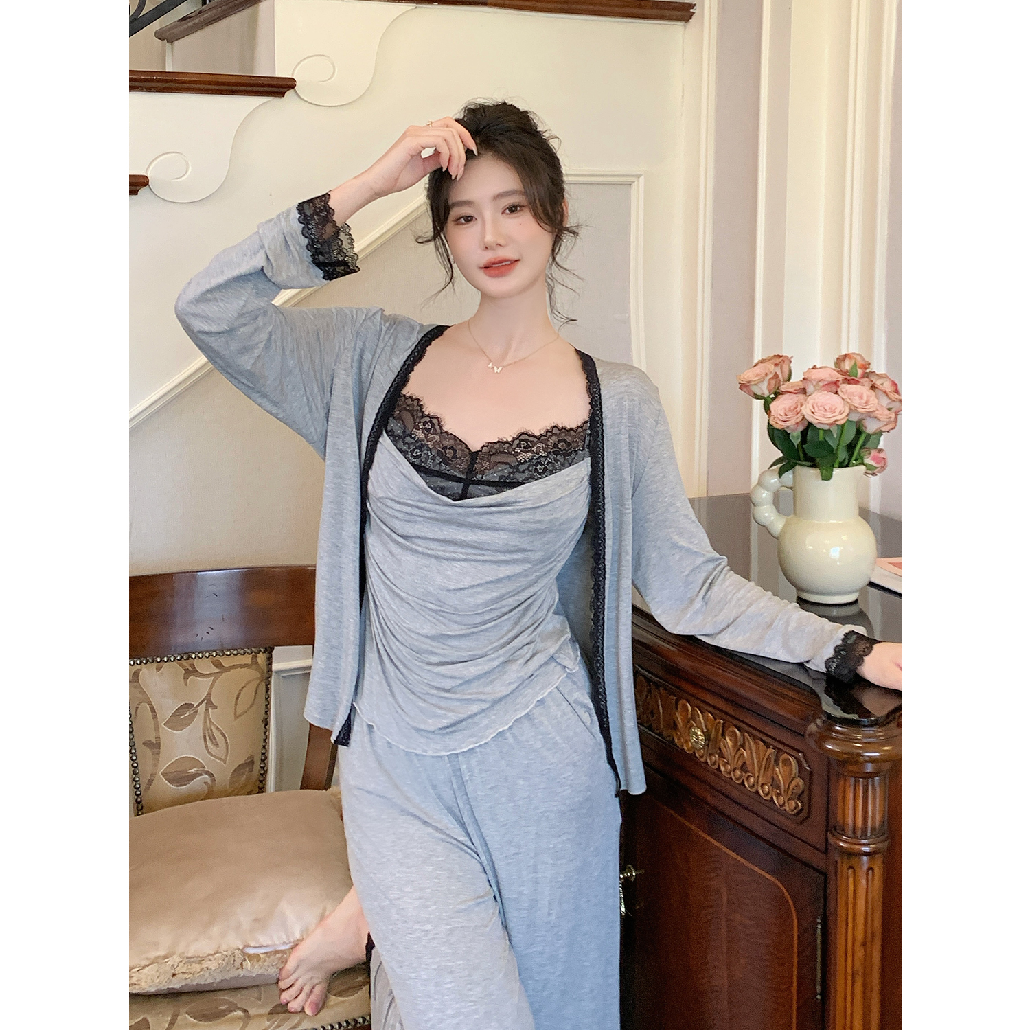 带胸垫家居服套装 原创设计感法式 新款 例蕾莫代尔棉吊带睡衣女秋季