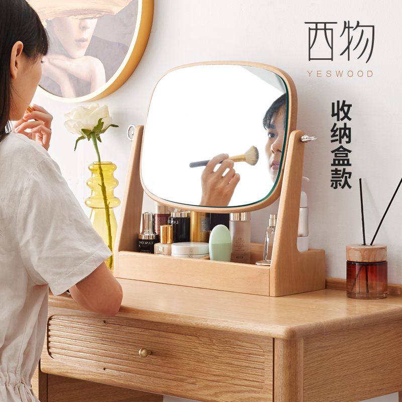源氏木语西物化妆镜实木家用卧室网红化妆镜收纳盒一体翻转梳妆镜