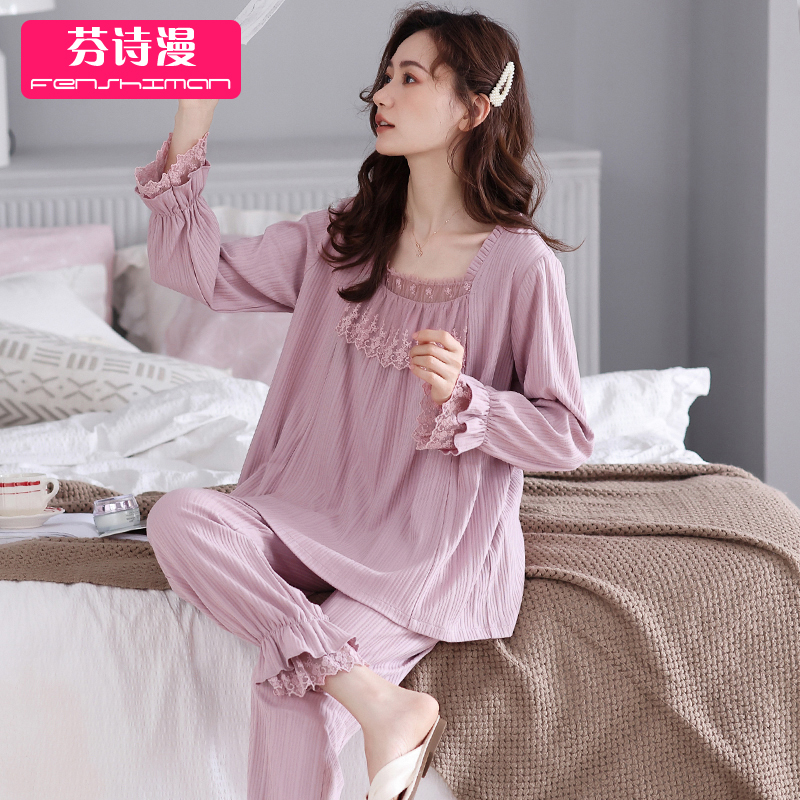 宽松休闲加大码 芬腾女士睡衣春秋纯棉长袖 新款 套装 全棉家居服 开衫