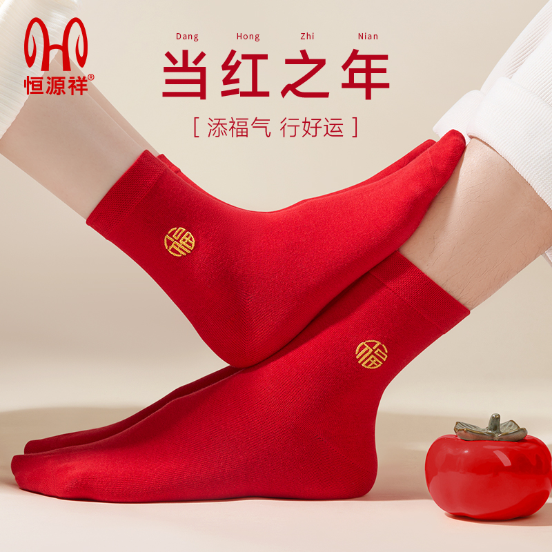 恒源祥本命年红袜子结婚情侣一对纯棉男士 春秋中筒袜女属蛇年礼物