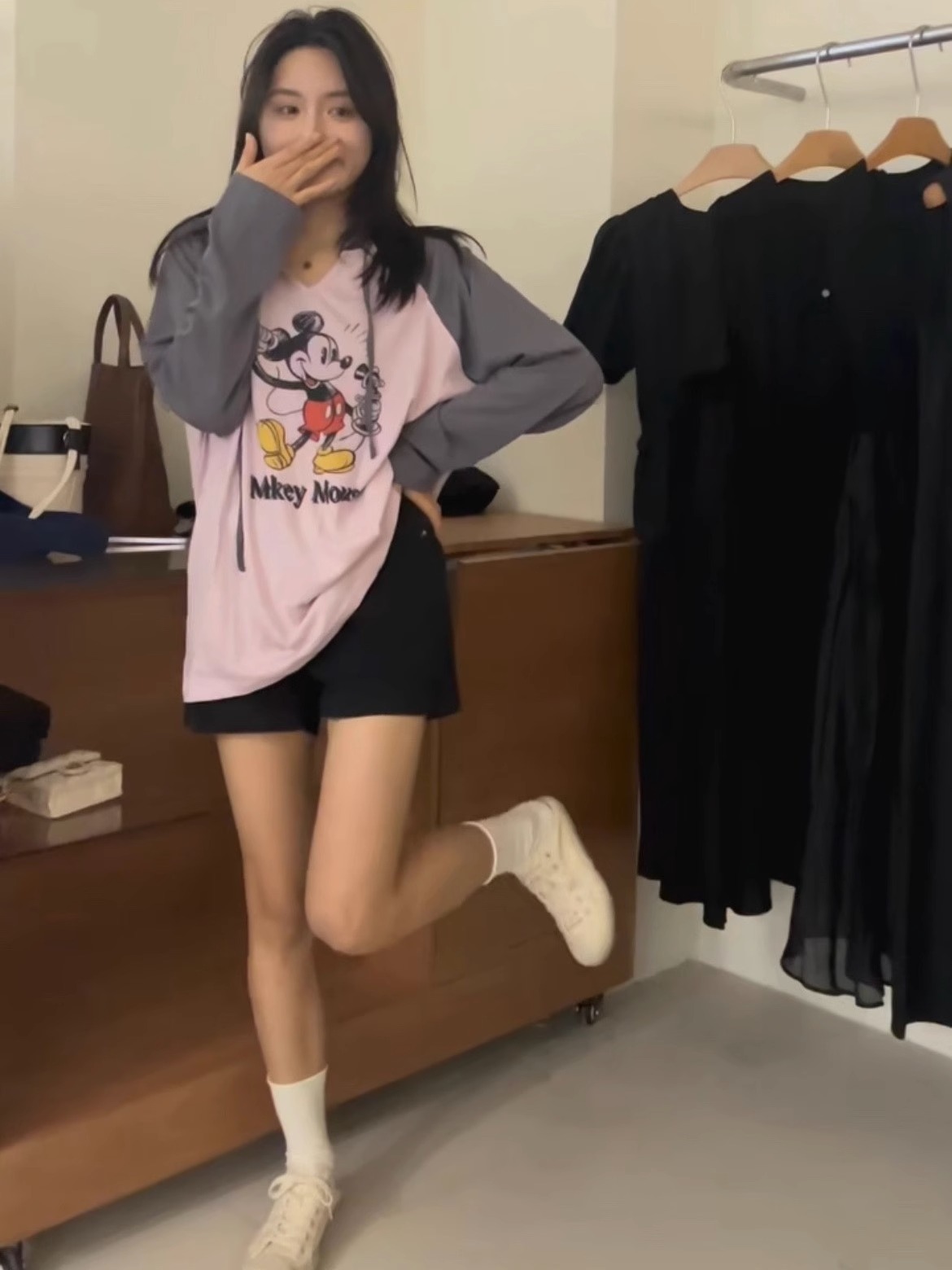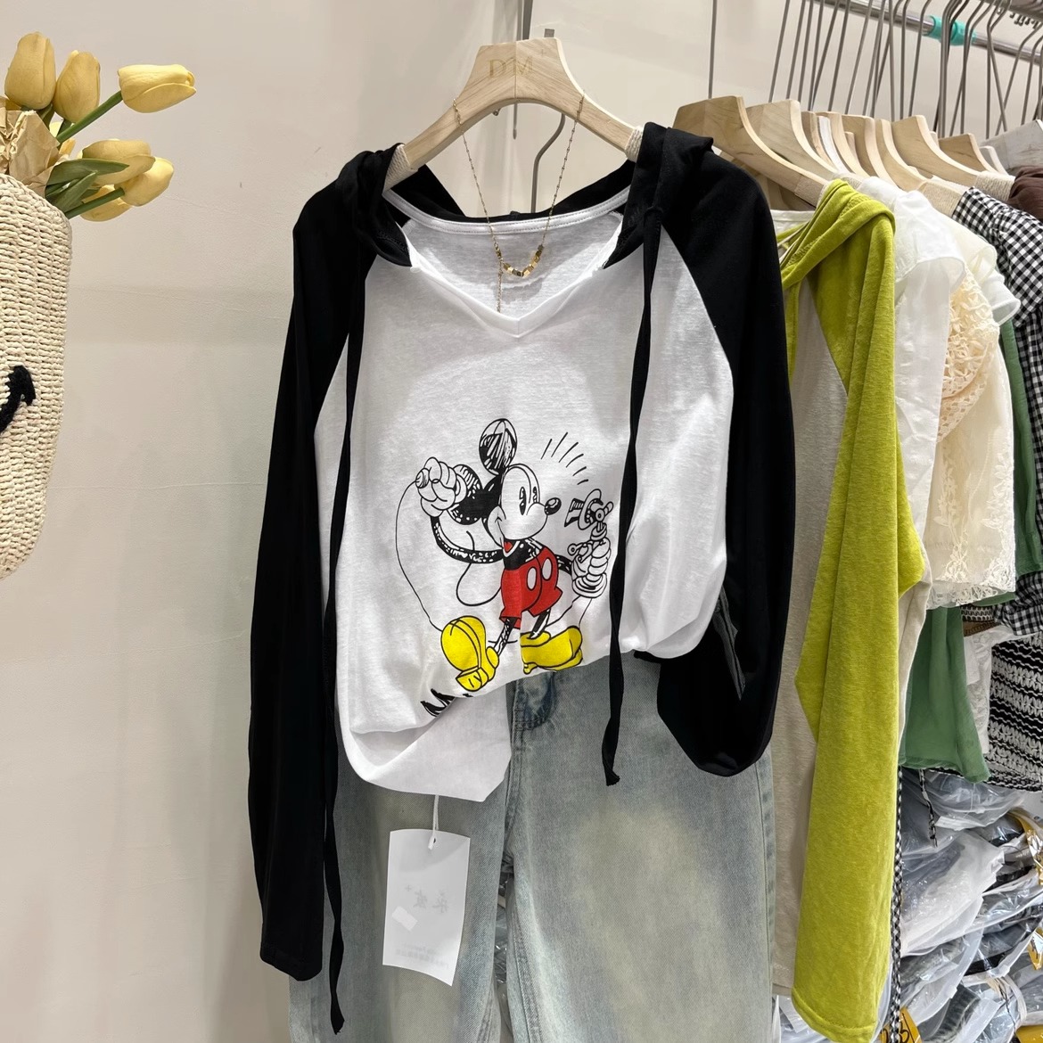 设计感插肩袖 t恤女2023早秋休闲轻薄透气防晒上衣ins 连帽米奇长袖