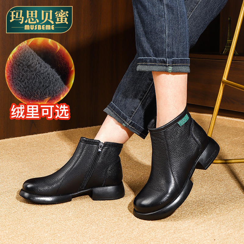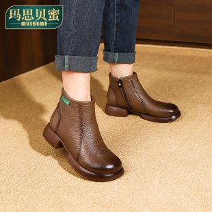 女鞋 新款 中年擦色单靴软底低跟马丁靴女靴子 短靴秋冬季 真皮妈妈鞋
