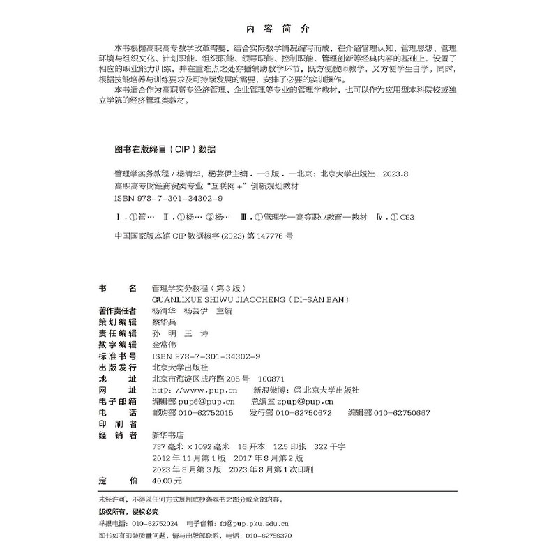 高职高专财经商贸类专业 社9787301343029 管理学实务教程 北京大学出版 创新规划教材 互联网 杨芸伊 杨清华 第3版 2023新书 正版