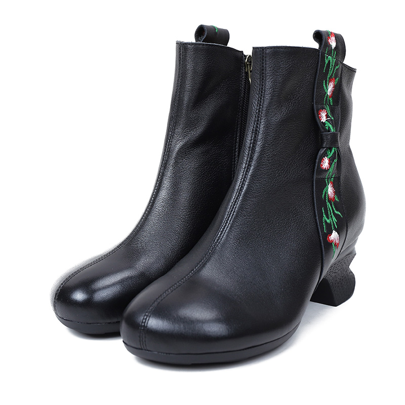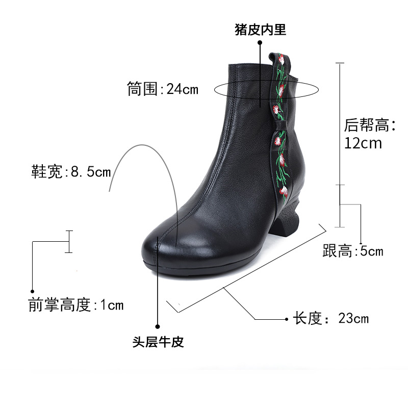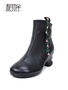 复古圆头民族风原创粗跟靴子 绣花鞋 相伴皮鞋 女真皮软短靴秋冬新款