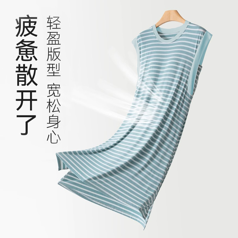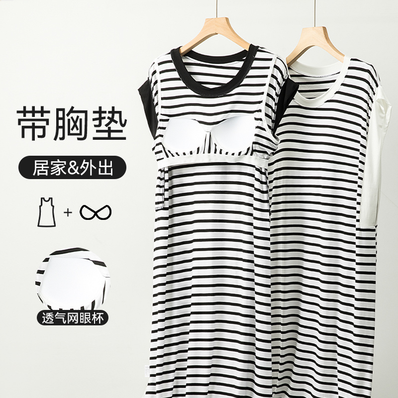 带胸垫睡裙女夏天2025新款 背心条纹冰丝莫代尔孕妇睡衣连衣裙 无袖