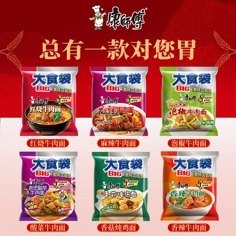 康师傅方便面大食袋经典 泡面速食面 系列红烧泡椒酸菜牛肉面24袋装