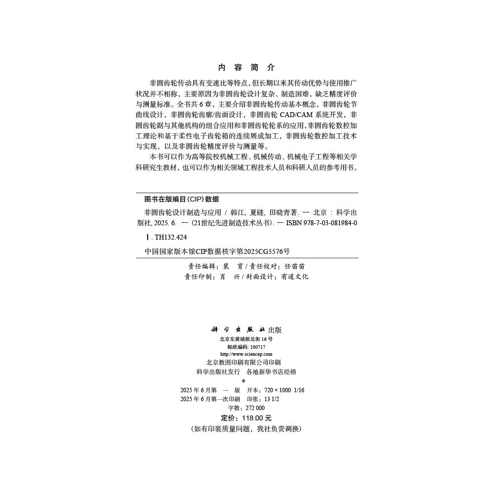 田晓青 夏链 9787030819840 韩江 非圆齿轮设计制造与应用