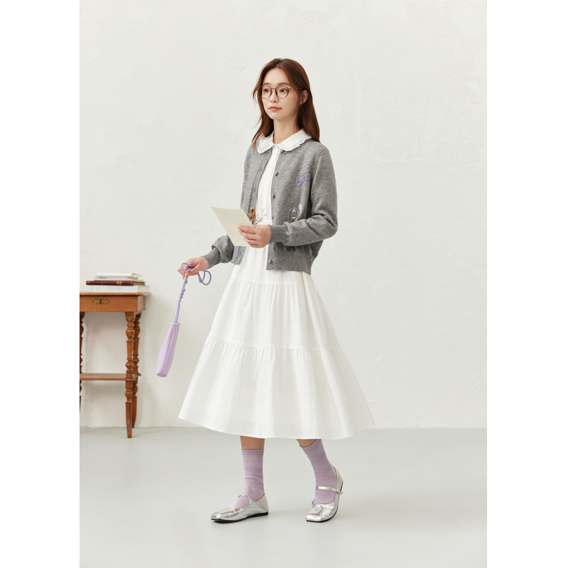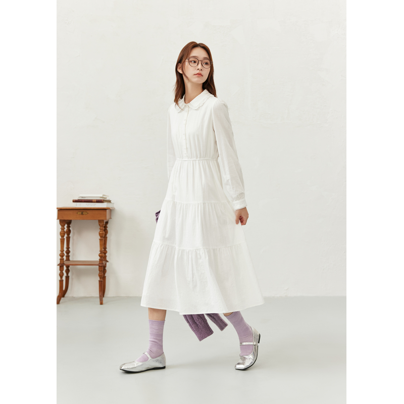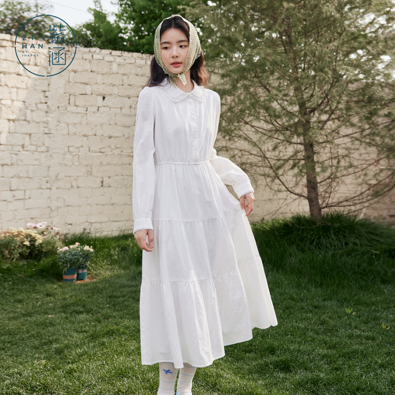 温柔文艺收腰显瘦a字白色长裙 新款 紫涵翻领长袖 连衣裙女2025秋季