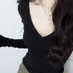 显瘦黑色打底衫 内搭正肩辣妹收腰修身 上衣 T恤女春季 纯欲风V领长袖