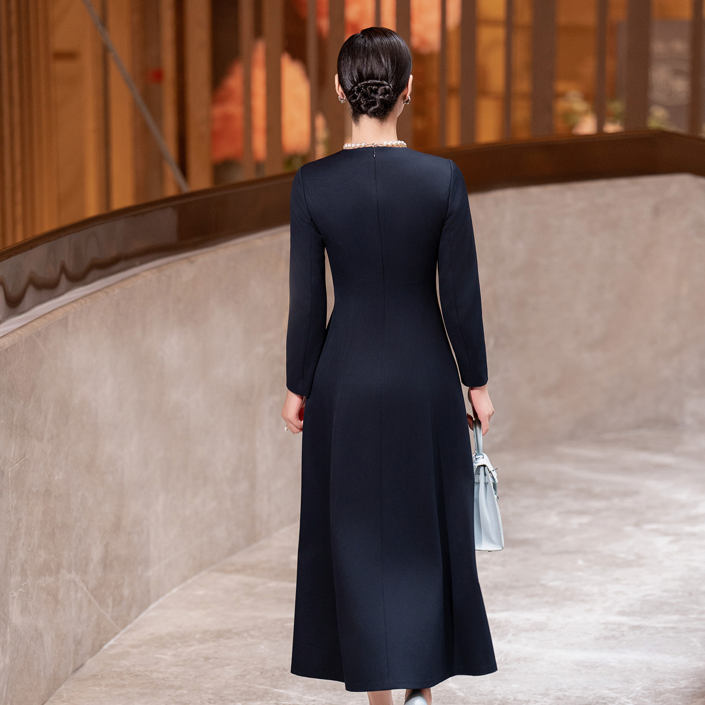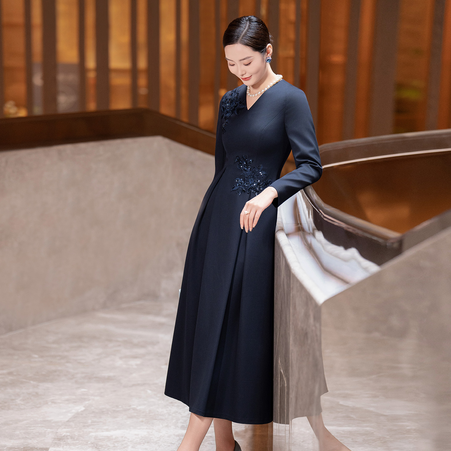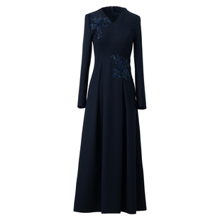 气质高级感V领贴花修身 时尚 大摆裙子 连衣裙女2025新款 藏蓝色秋季