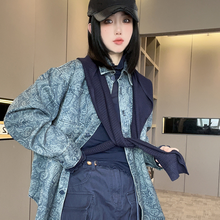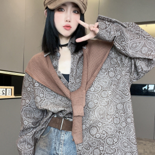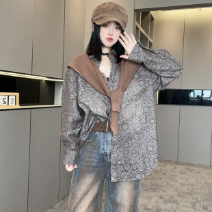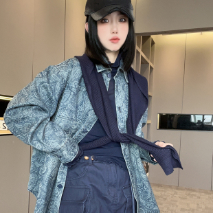 上衣 欧洲站针织披肩图案印花单排扣翻领长袖 外套女2025秋季 新款