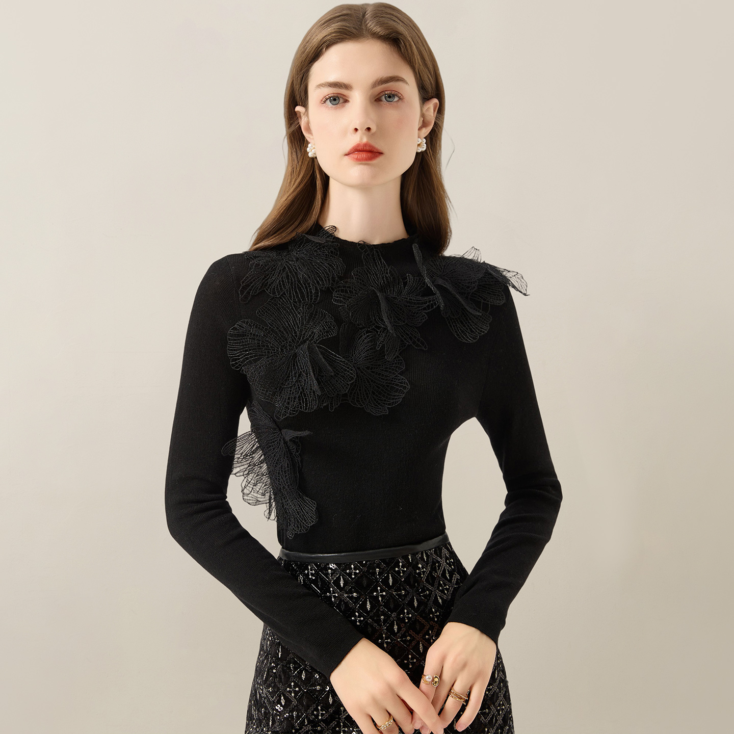 别致针织衫 2025秋季 上衣半高领法式 气质蕾丝花边洋气打底衫 女 新款