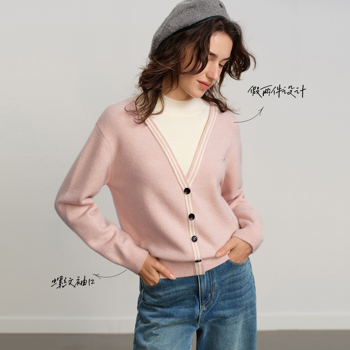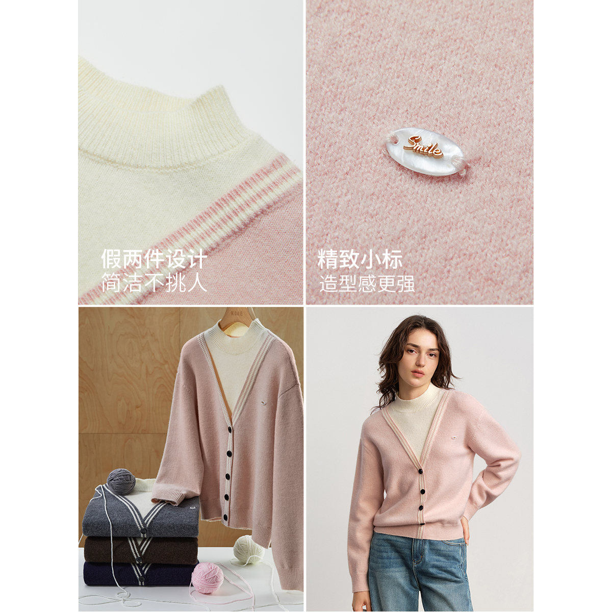 女毛衣宽松上衣 外套25早秋穿搭新款 阔色粉色撞色假两件针织衫 开衫
