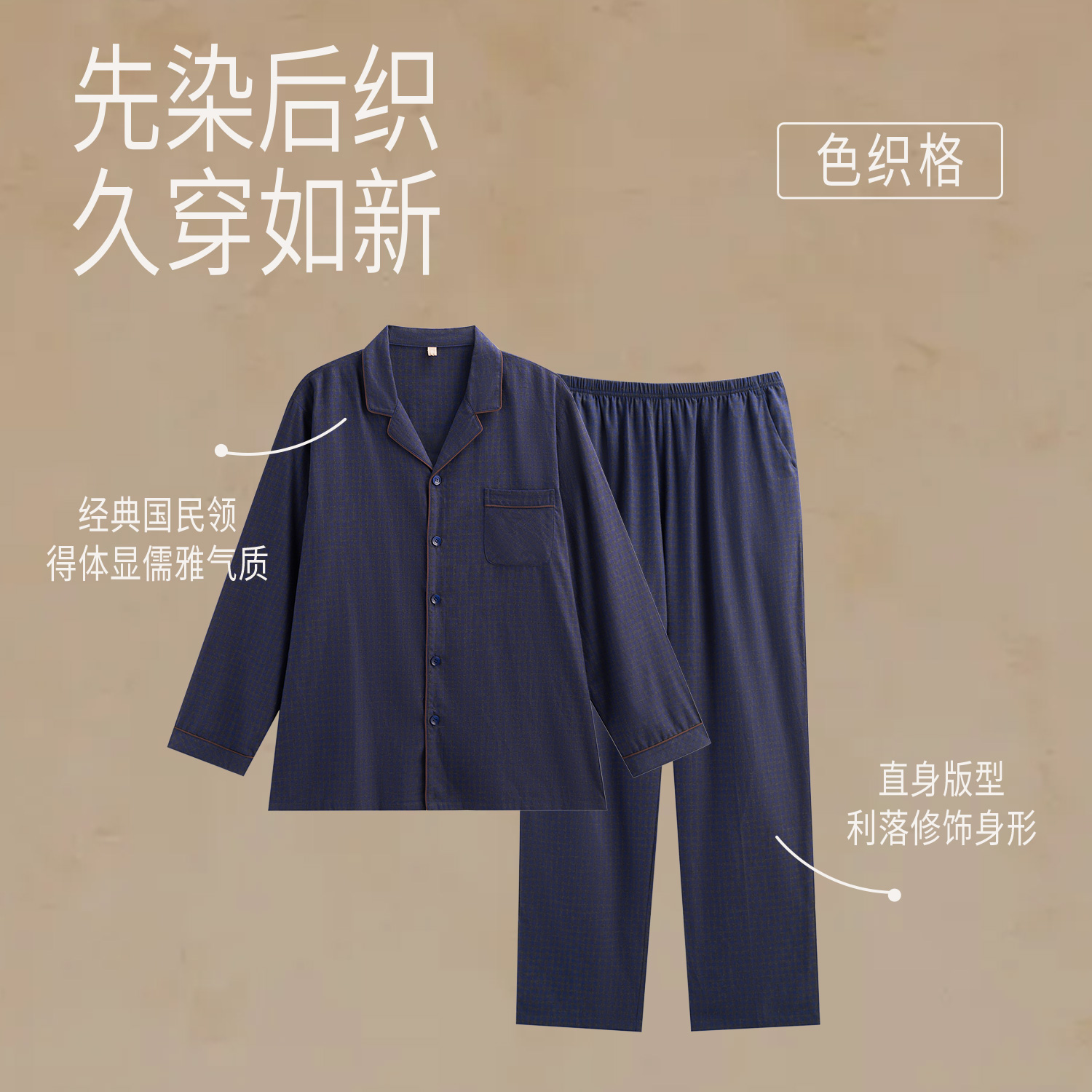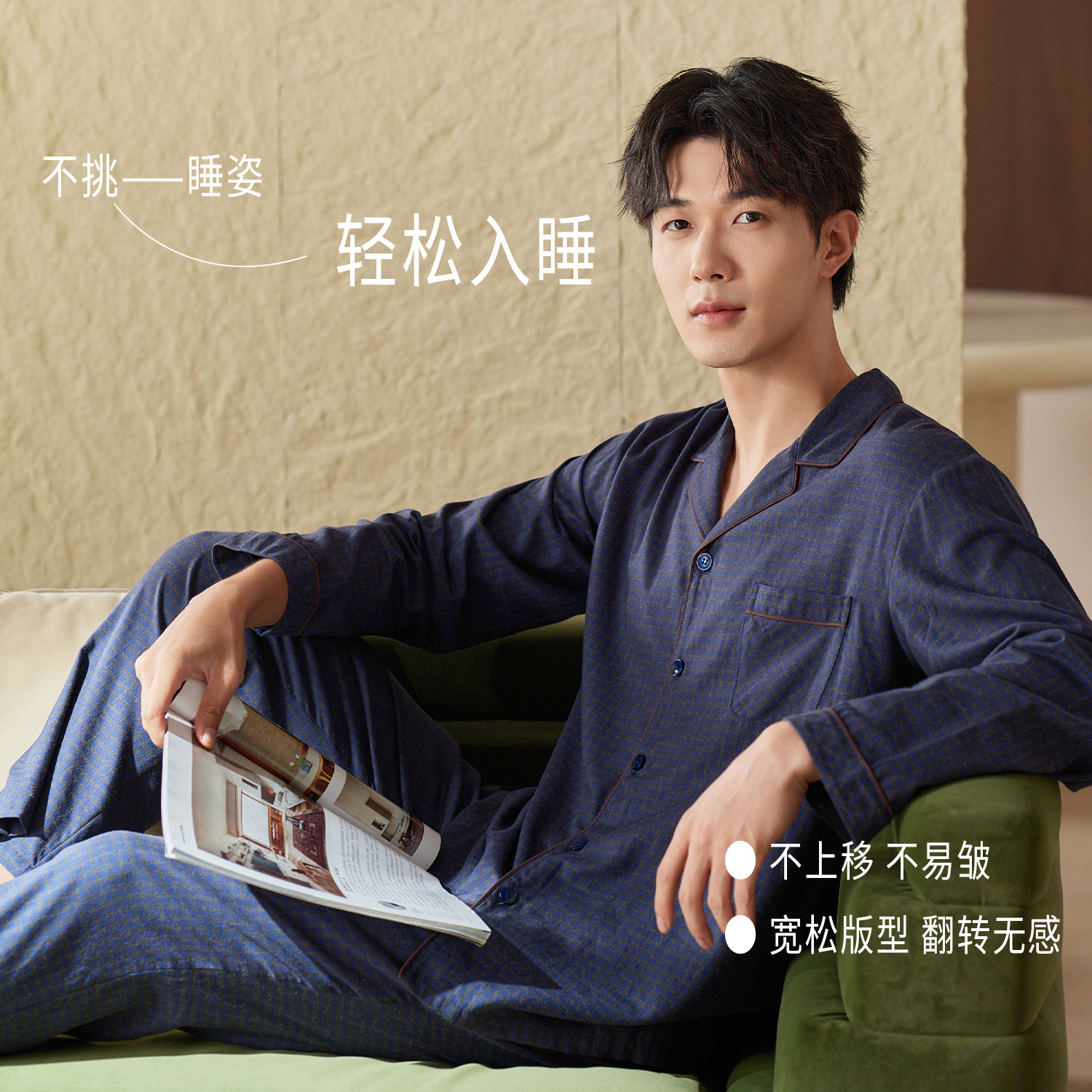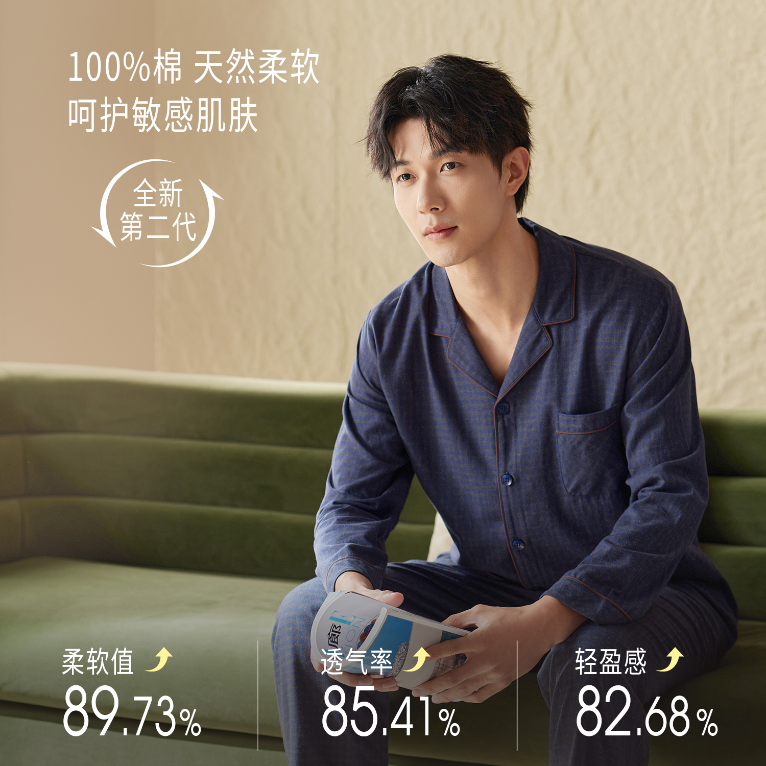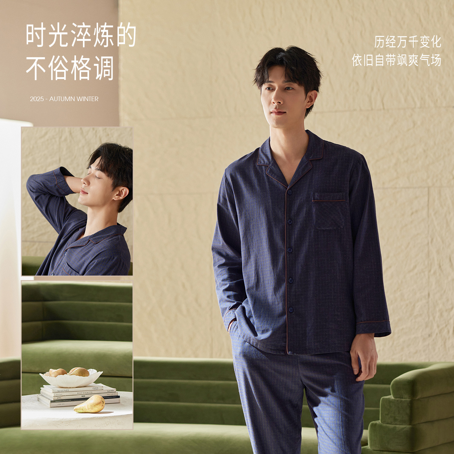 家居服套装 长袖 柔软春秋透气阳光棉睡衣男女 开衫 松山棉店棉柔男士